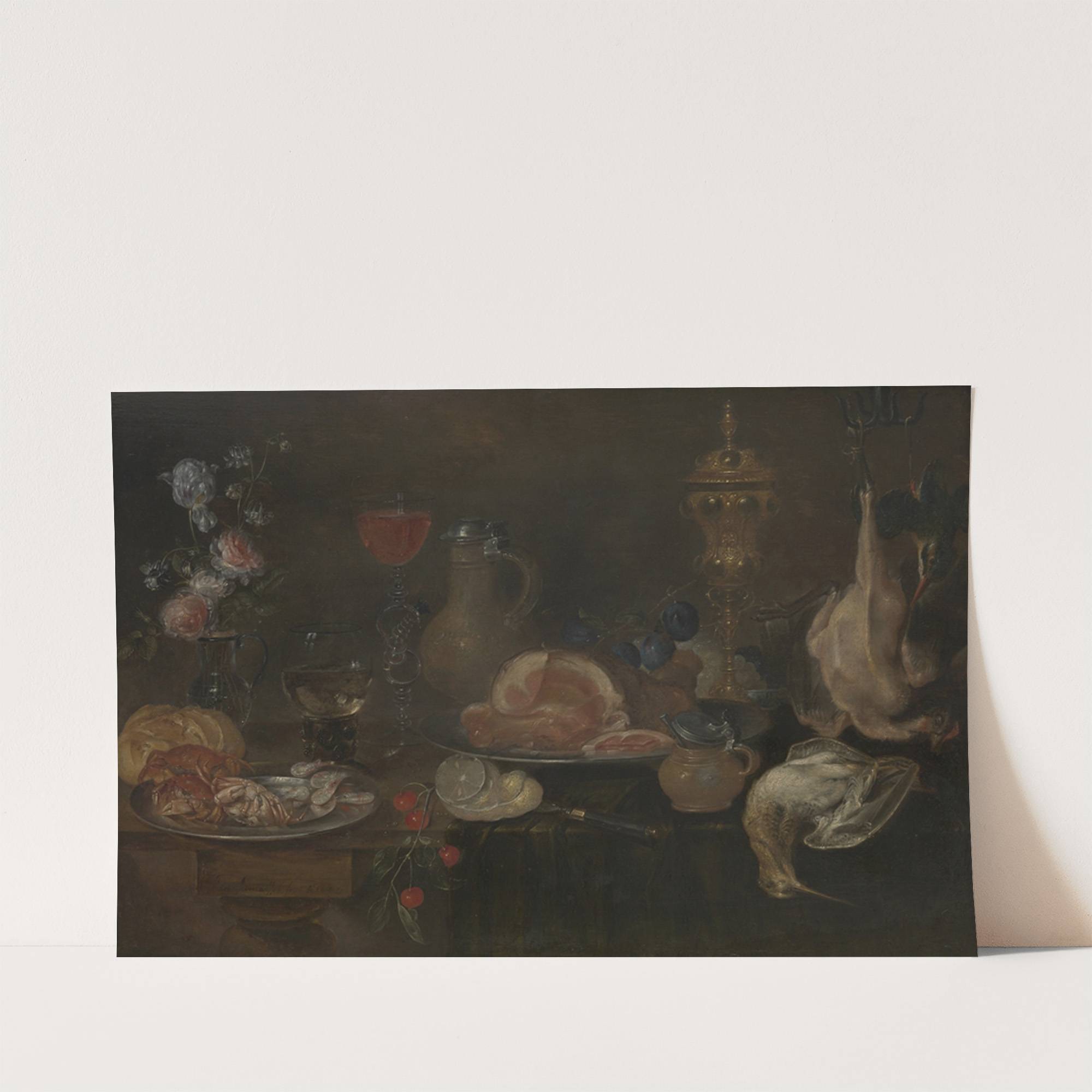 This exquisite print features "Still Life with Flowers, Ham, Game, Shellfish and Fruit," an intricately detailed masterpiece by the renowned artist Alexander Adriaenssen. The composition captures a rich, dark palette with meticulous attention to texture and light. On a deep...