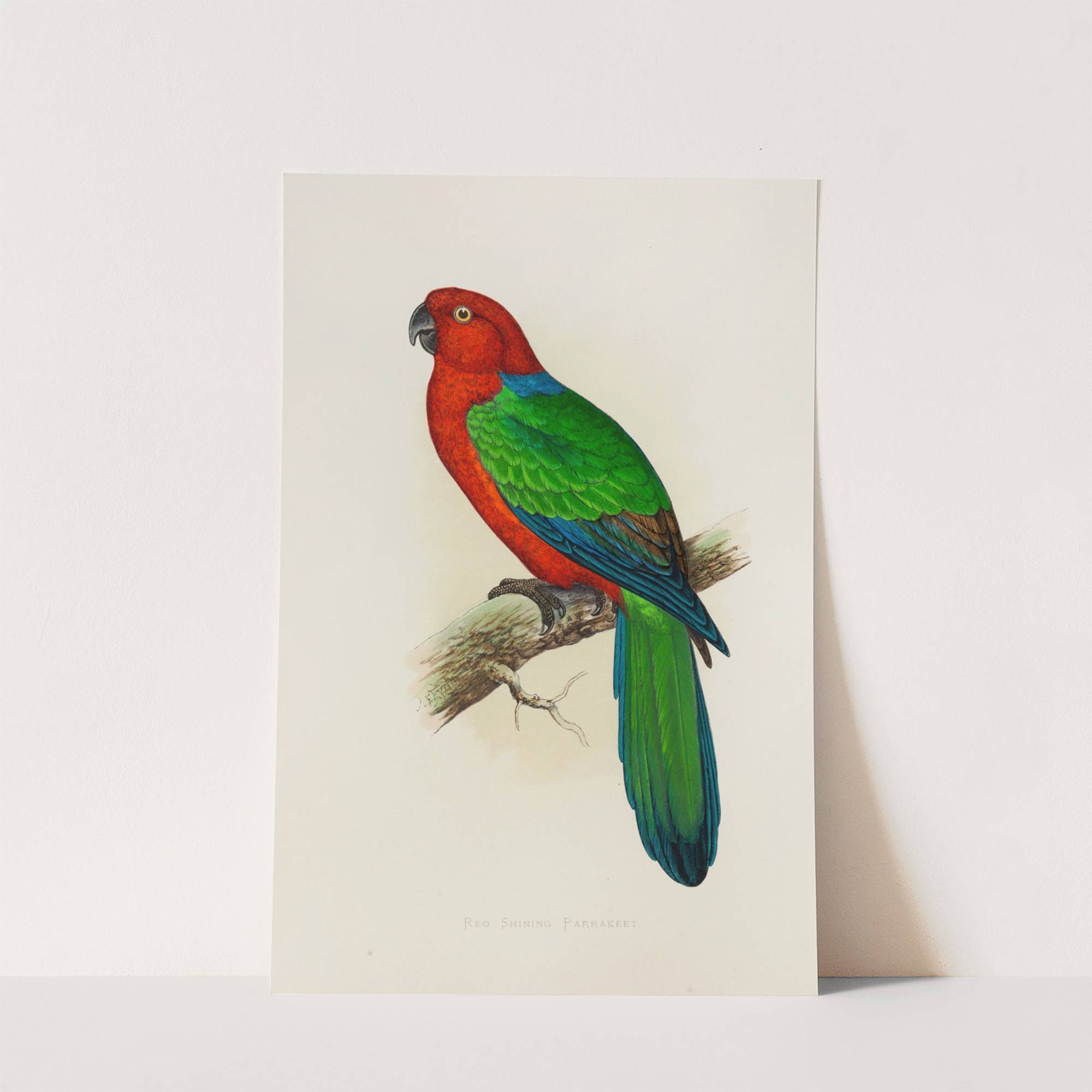 This vibrant illustration captures a red shining parakeet perched gracefully on a branch, rendered in a rich, colorful style typical of 19th-century naturalist art. The bird's vividly red head and chest stand out against the delicate white background, while its...