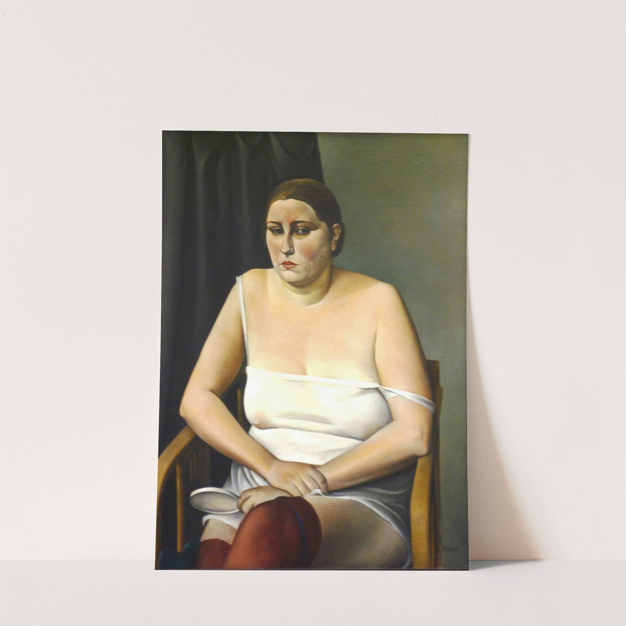 This art print features "Halbakt II" by Alexander Kanoldt, a striking painting of a woman seated in a chair. Rendered in a realist style with a subtle, painterly quality, the piece captures the subject with remarkable detail and nuance. The...