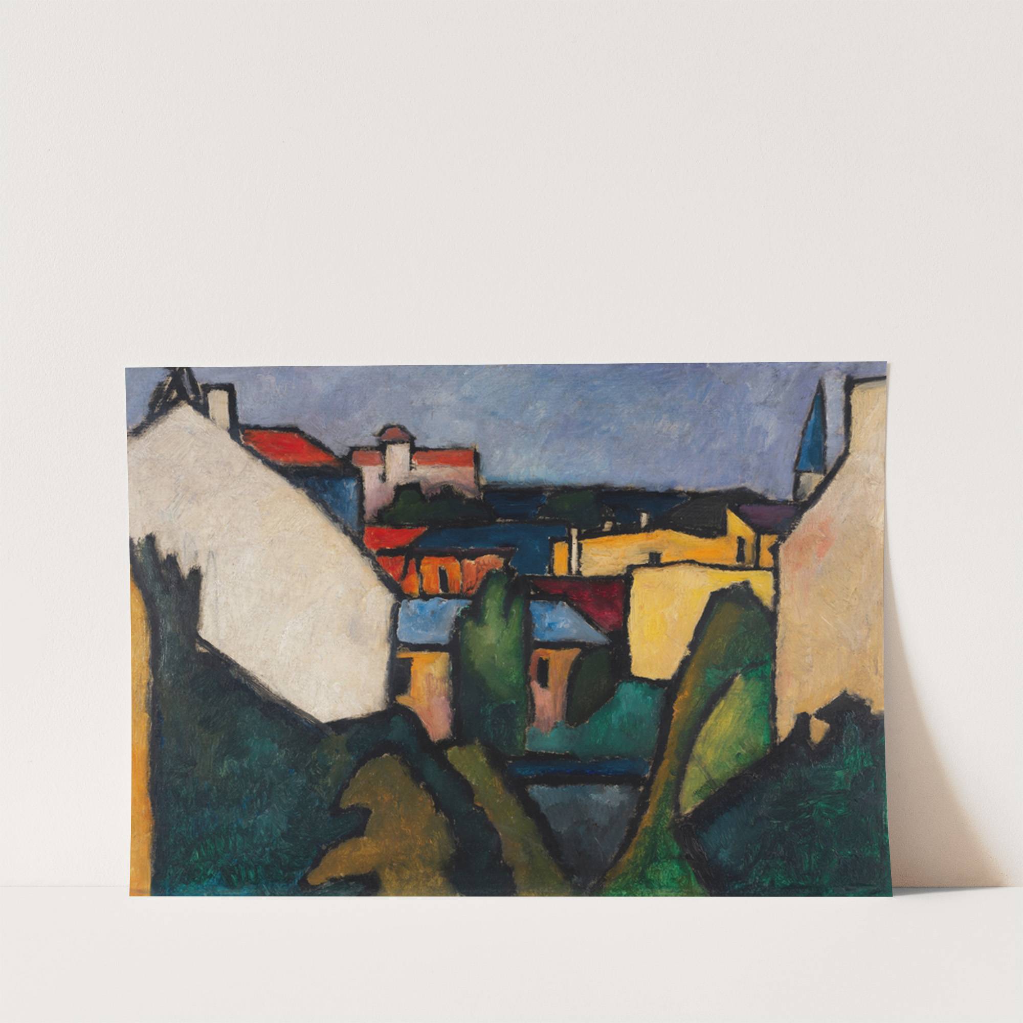 This vibrant art print features "Häuser" by Alexander Kanoldt, a masterpiece of early 20th-century expressionism. The composition showcases a stylized urban landscape, rendered in bold, geometric shapes with thick, expressive brushstrokes. Bright red and yellow buildings contrast against dark green...