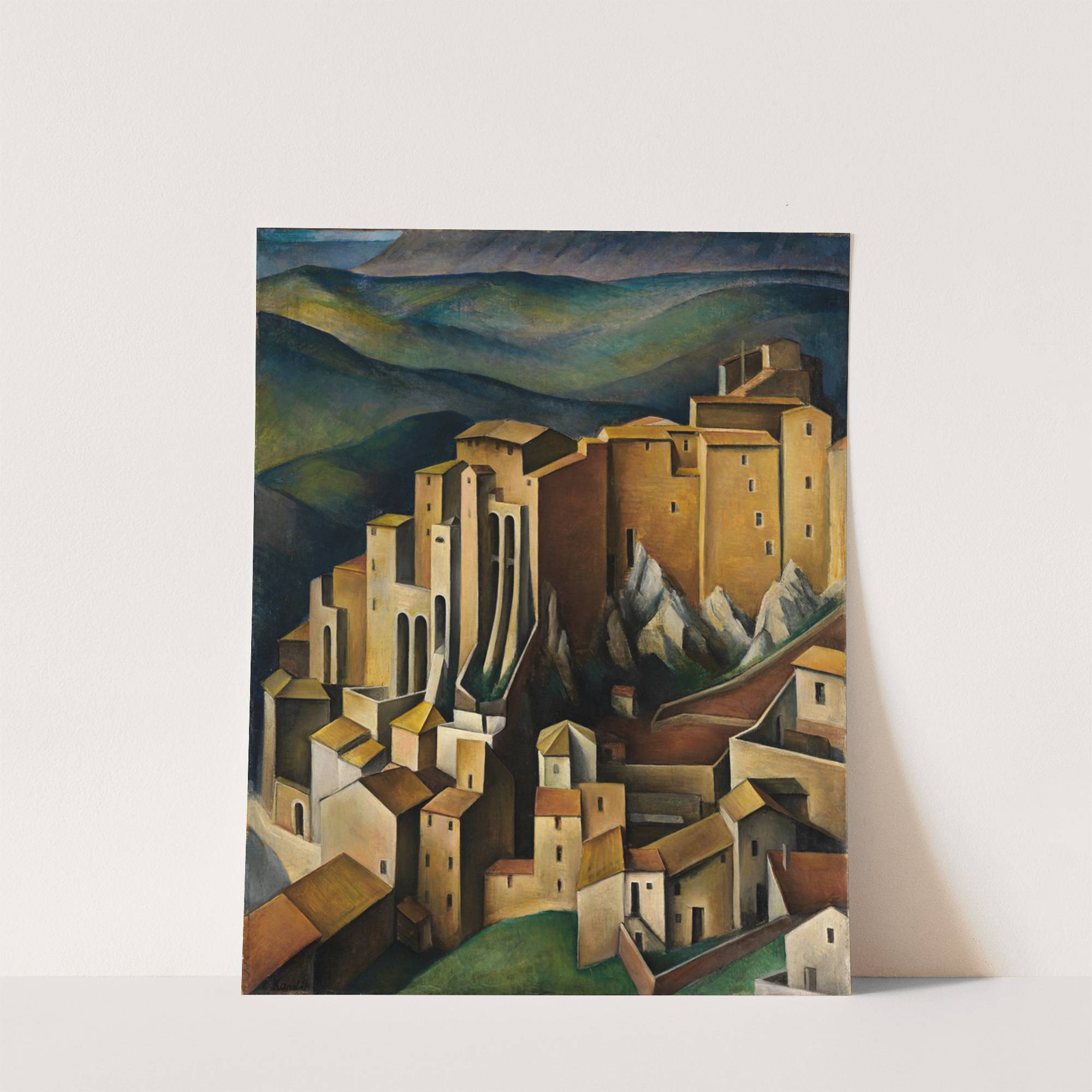 This art print features "Olevano" by Alexander Kanoldt, a captivating representation of a medieval hill town nestled among rugged mountain landscapes. The artist employs a vibrant and rich color palette with deep blues and greens in the rolling hills contrasting...