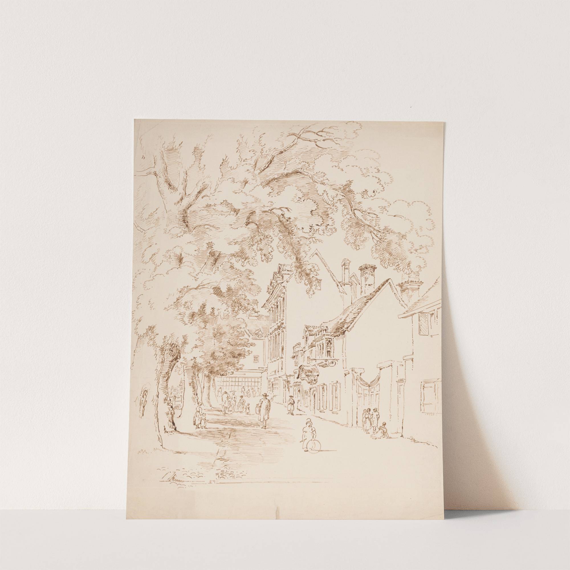 This delicate line drawing captures the serene charm of "Buildings Belonging to Magdalen Hall, Oxford" by Alexander Monro. Rendered in fine sepia ink, it features a tranquil street scene with detailed architectural elements and lush tree foliage. The houses, with...