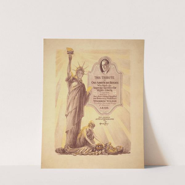This unique art print features an intricate combination of classical imagery and modern typography, showcasing the Statue of Liberty in sepia tones. The statue, standing tall with her iconic torch held high, gazes outward symbolizing freedom and liberty. Below her...