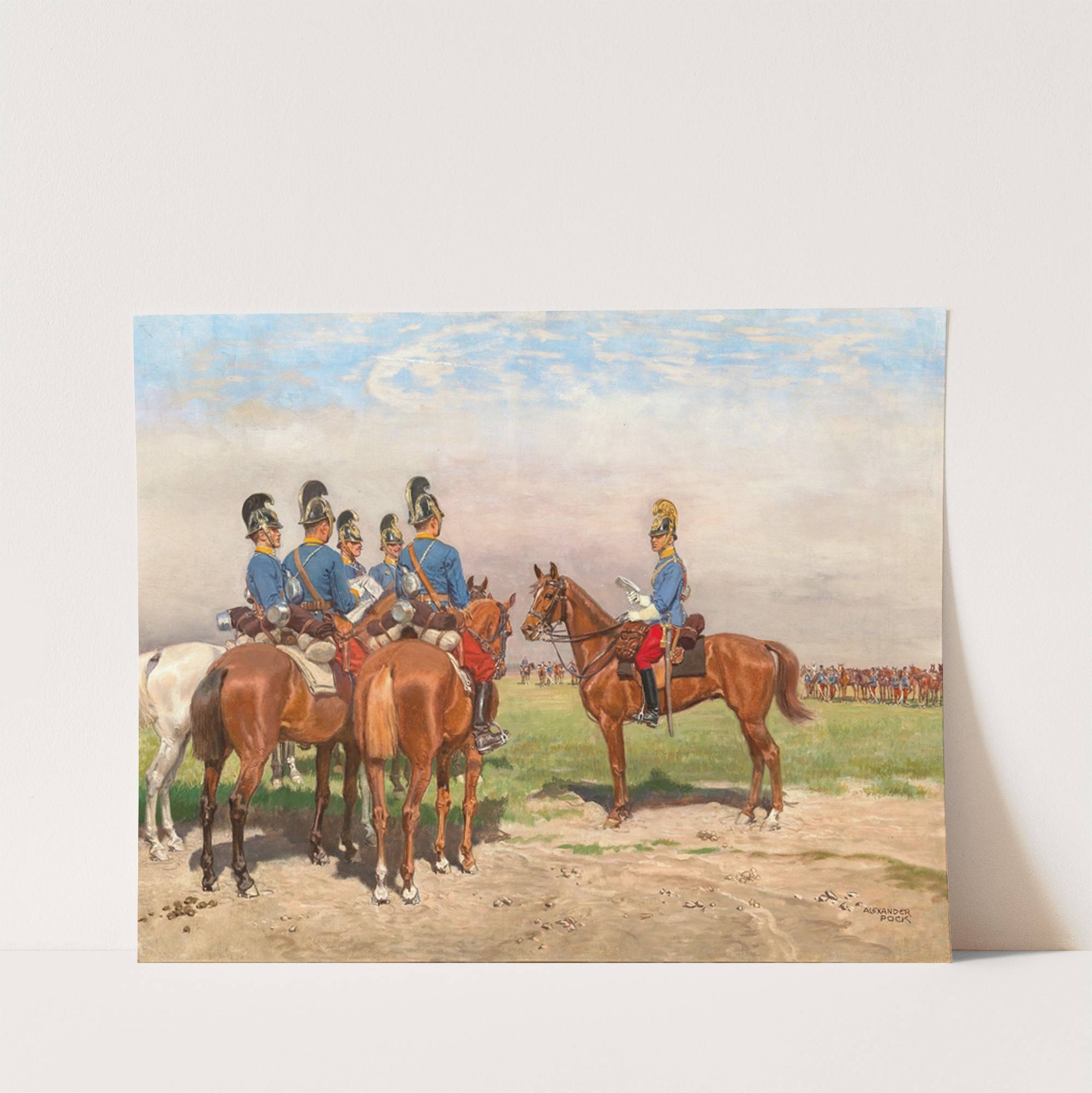 This vibrant artwork titled "Officer and Dragoon" by Alexander Pock captures a dynamic scene of British cavalry officers in historic uniforms. The painting features five soldiers with different brown horse breeds, each equipped with red and blue military attire that...