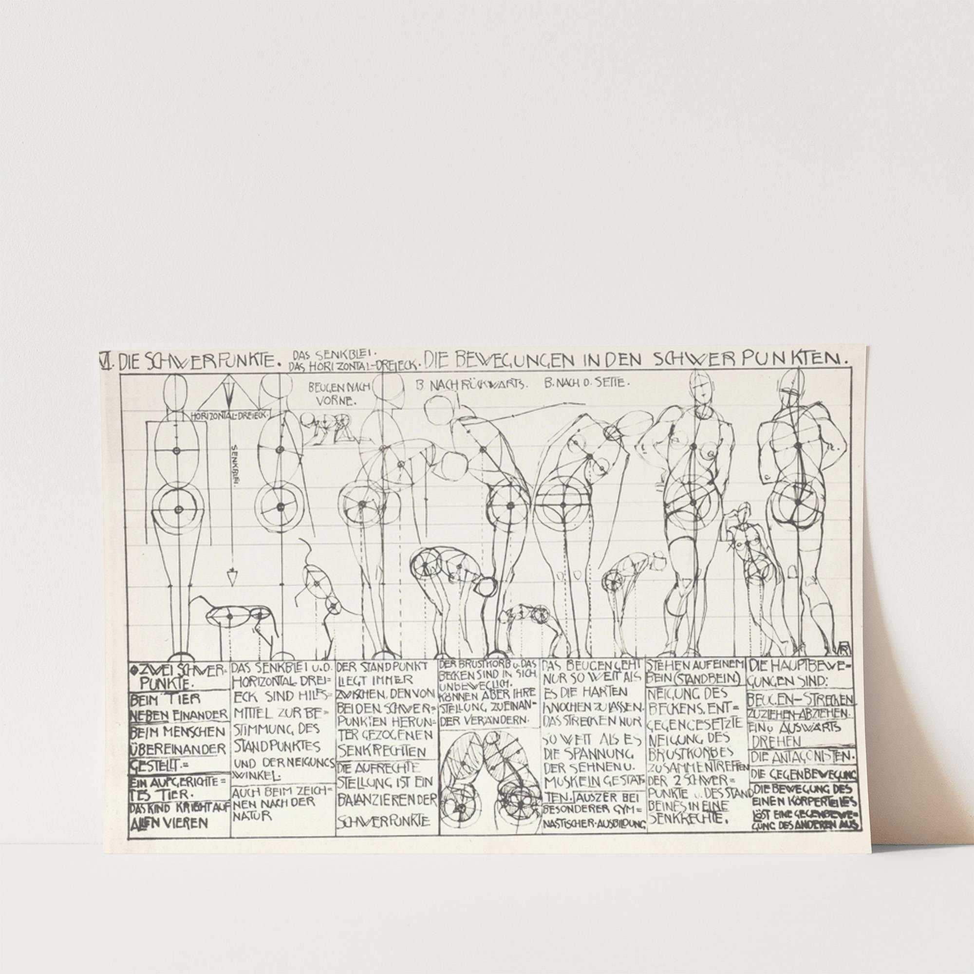 This art print titled "Statik und Dynamik des menschlichen Körper" by Alexander Rothaug features a detailed black-and-white line drawing that explores the anatomy of human figures in various dynamic poses. The composition includes multiple male and female figures, each with...