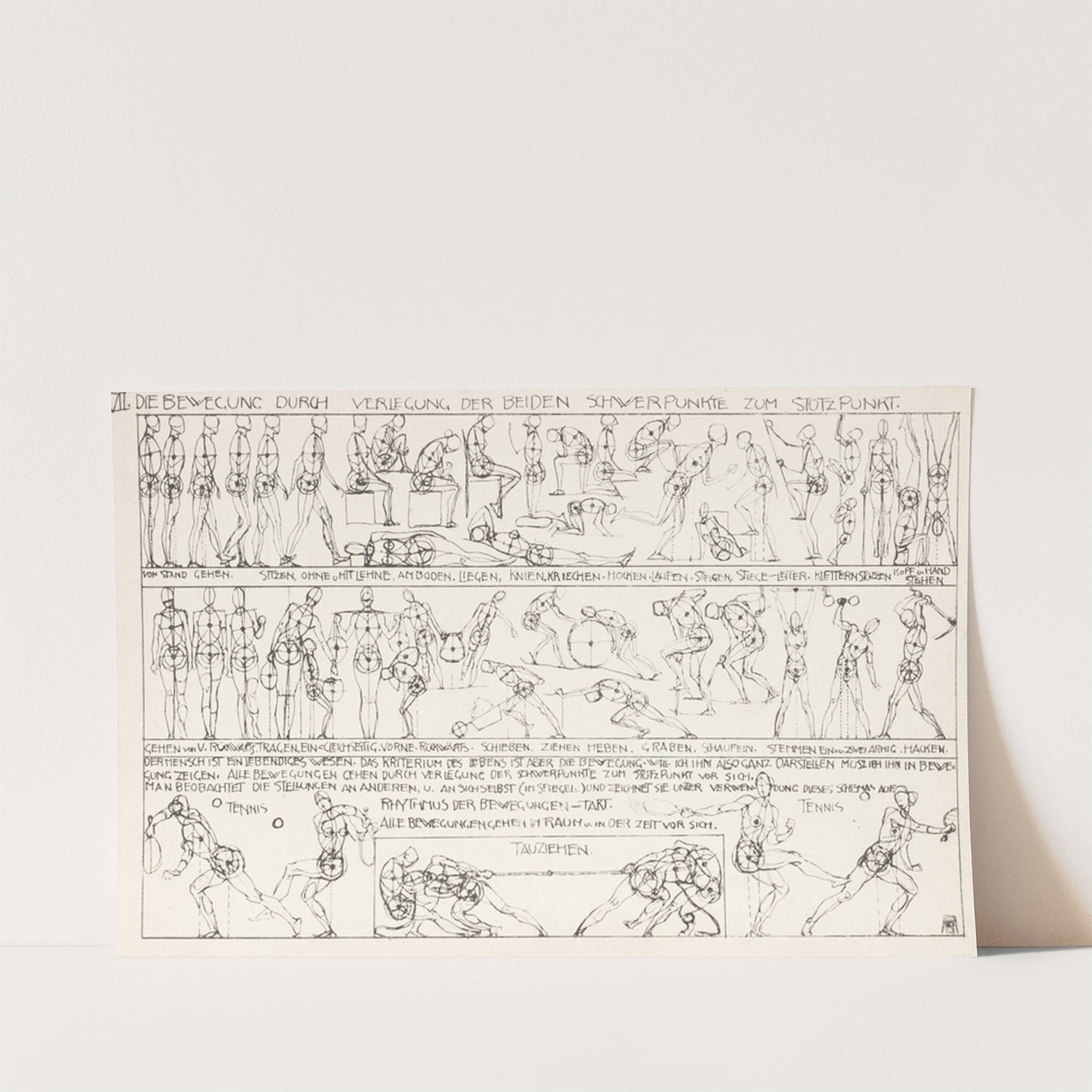 This monochrome line-art print features "Statik und Dynamik des menschlichen Körpers" by artist Alexander Rothaug. The black-and-white illustration depicts multiple human figures in various dynamic and static poses, arranged in three horizontal bands across the canvas. Each figure is intricately...