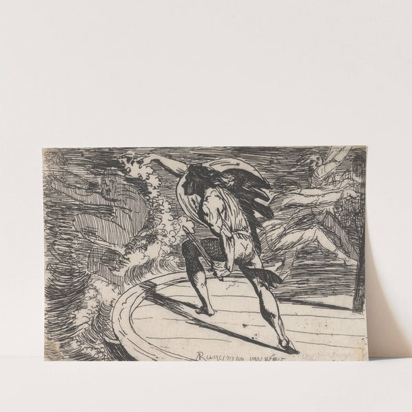 This black-and-white art print, "Rumination of the Furies" by Alexander Runciman, showcases an intricate and dynamic scene with strong linework and expressive detail. The central figure is a female character with long, flowing hair, captured mid-motion as she leans forward...