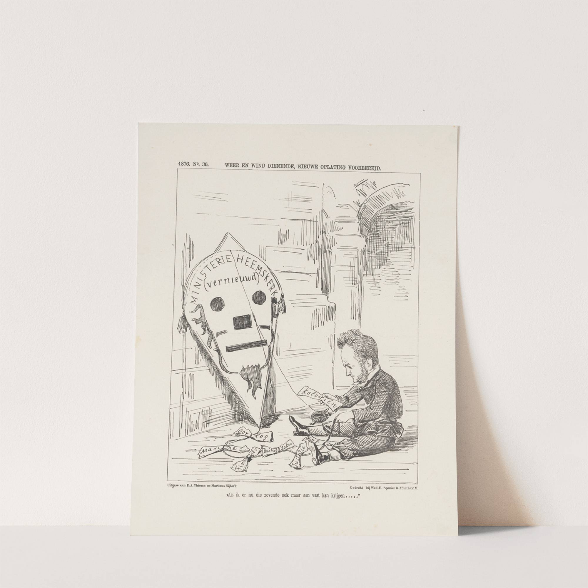 This art print features a black-and-white cartoon illustration titled "Wie in het eerste kwartaal van de hulp aan de trovenen van maart (1855)" by Alexander Ver Huell. The drawing depicts a striking contrast between human and artificial relief efforts. On...