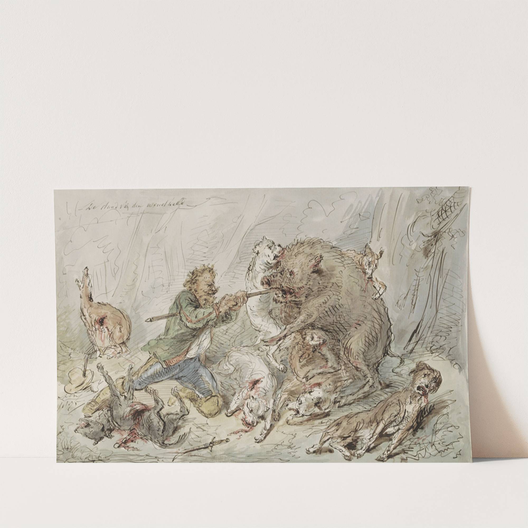 This captivating artwork depicts "Man die een wild zwijn doodt in een woud" (A Man Kills a Wild Boar in the Wood) by Alexander Van Loon. Executed with delicate yet expressive pencil and watercolor, this piece masterfully tells a rustic...