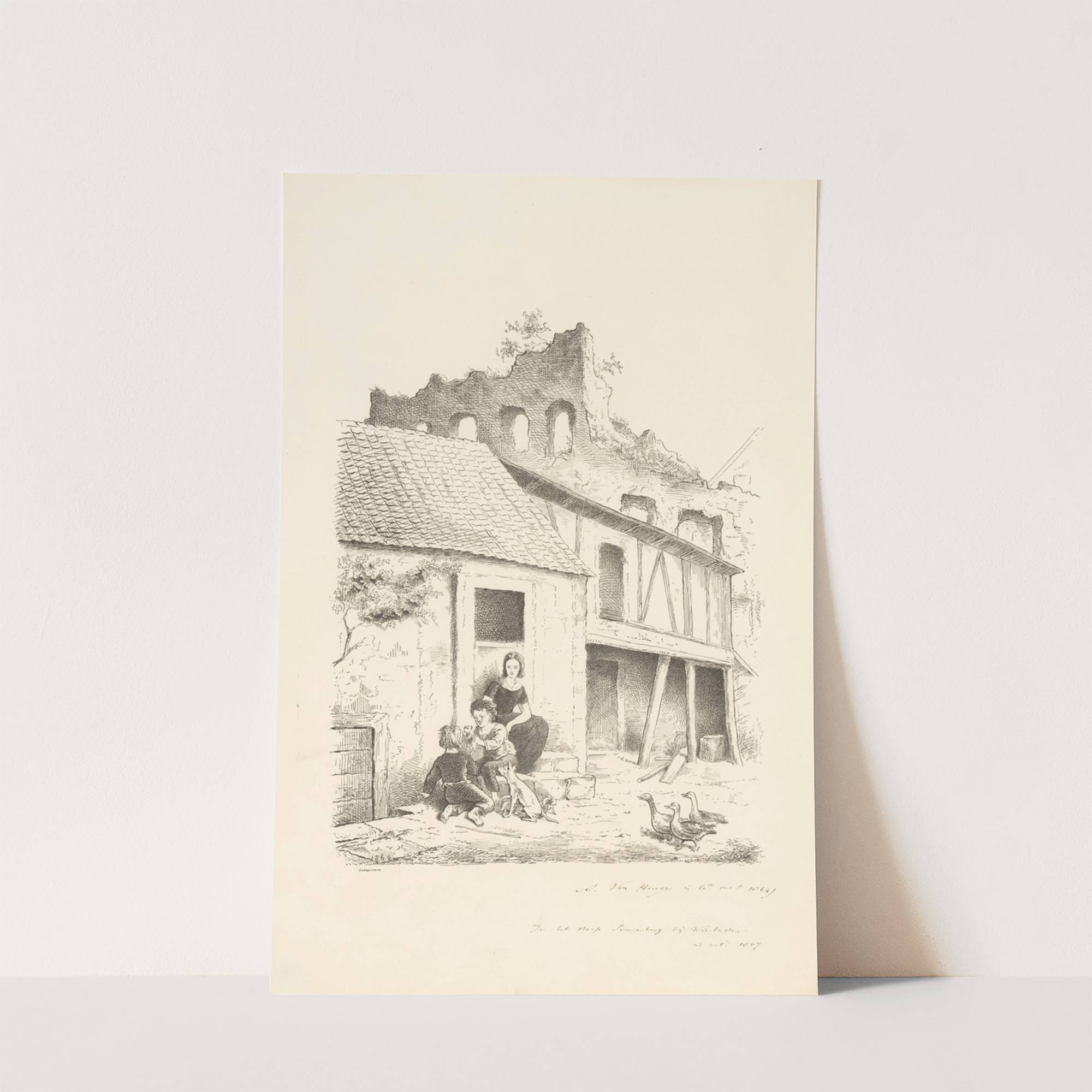 Vrouw en kinderen op stoep spelend met puppy’s (1864) by Alexander Ver Huell - Wall Art Print
