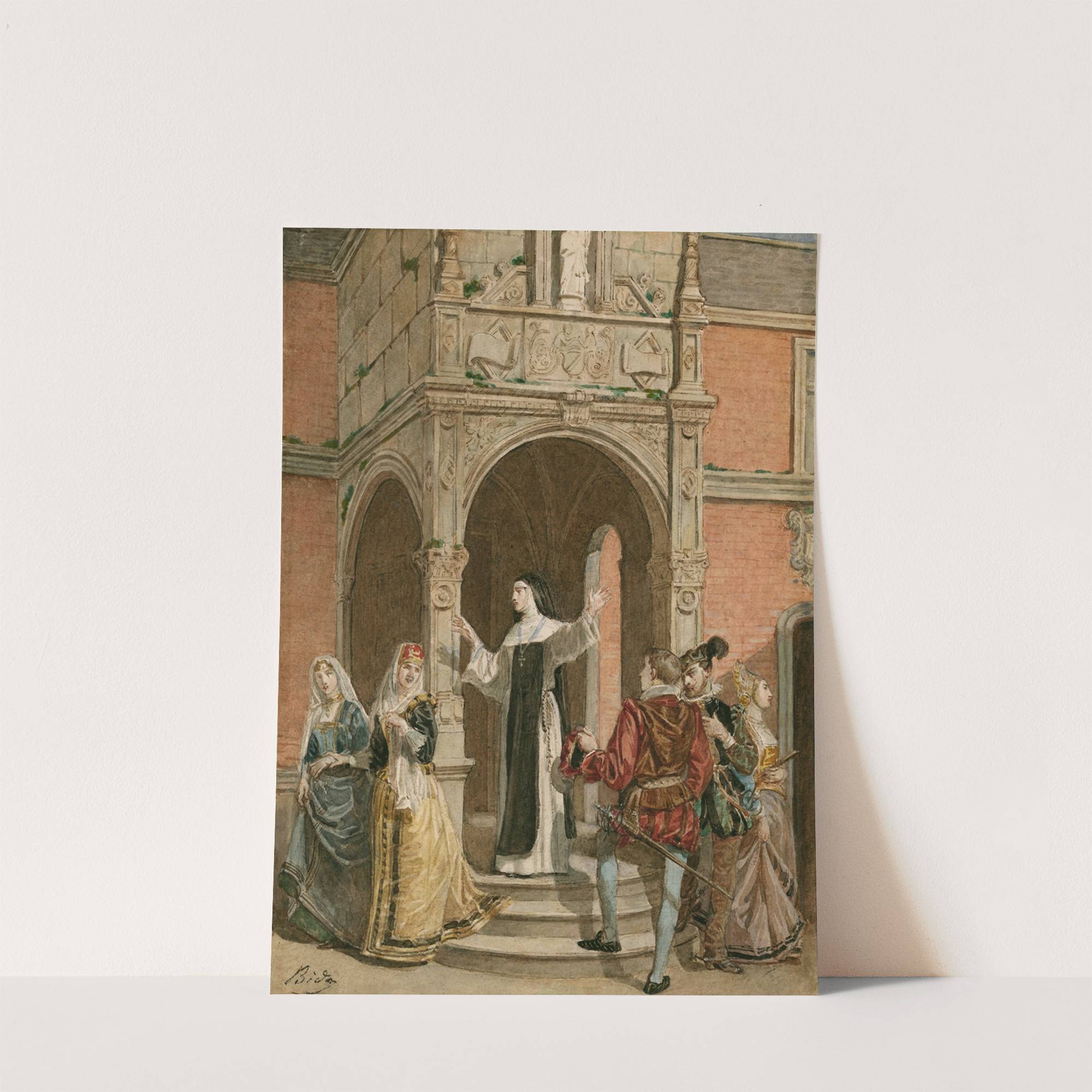 This artistic print depicts "Comedy of Errors, Act 5, Scene 1" by the renowned artist Alexandre Bida. The vibrant illustration captures a lively medieval courtyard setting with richly textured details and warm colors. At the center, a cleric in black...
