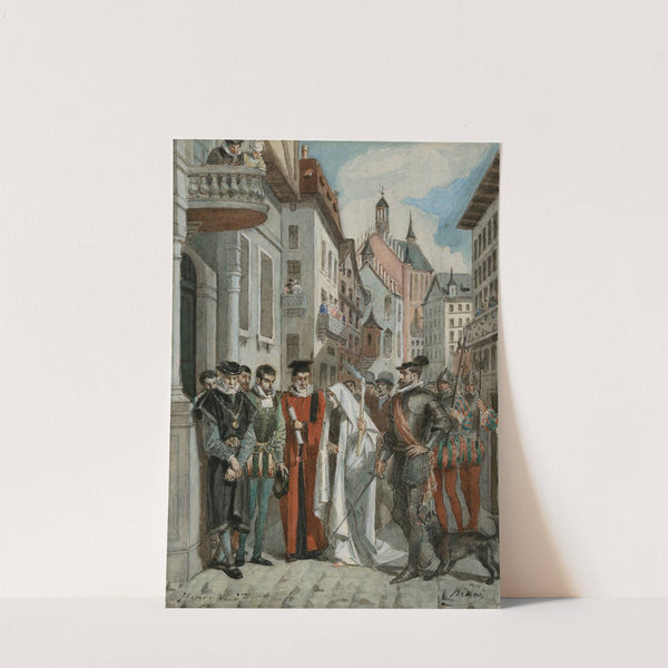 This art print features "Henry VI Part 2" by Alexandre Bida, a richly detailed illustration capturing the historical essence of a street scene from Shakespeare's play. The composition showcases a group of men in elaborate Renaissance-era clothing standing on a...