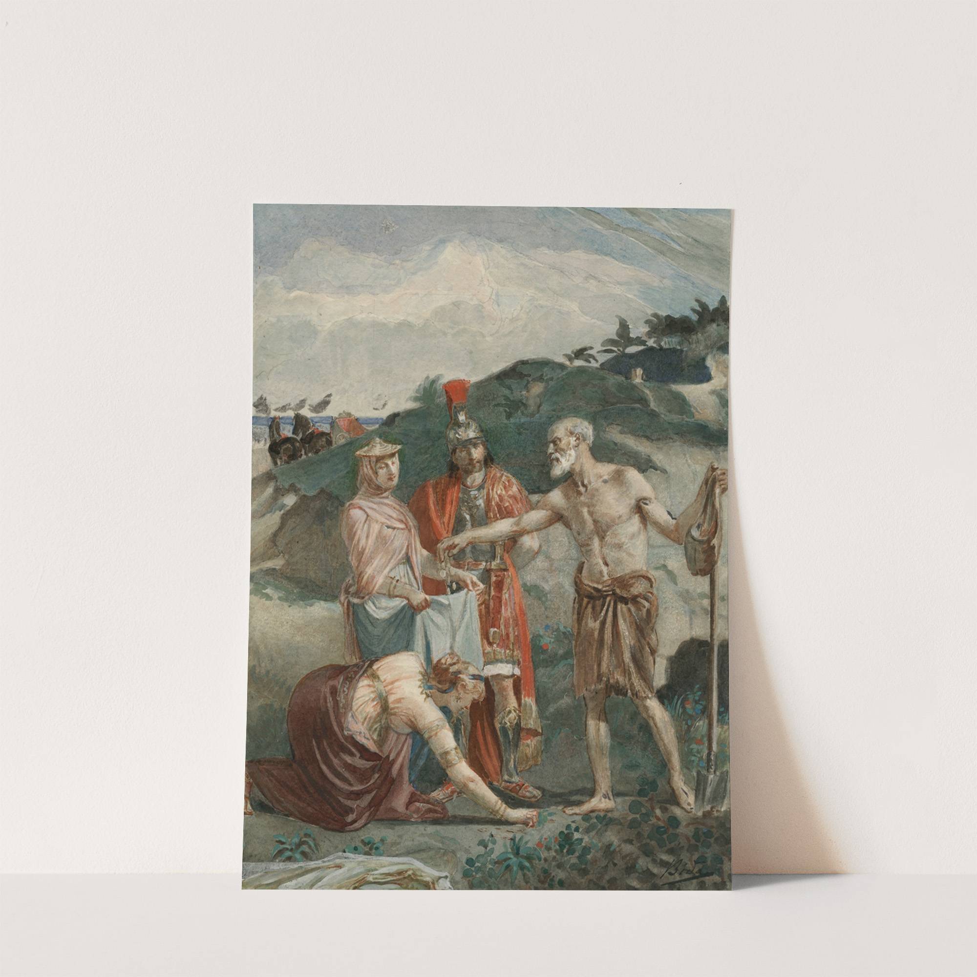 This artistic print titled "Timon of Athens, Act 4, Scene 3" (1893) by Alexandre Bida captures a poignant biblical or classical scene with rich detail and vivid colors. In the foreground, three male figures are engaged in an emotional encounter...