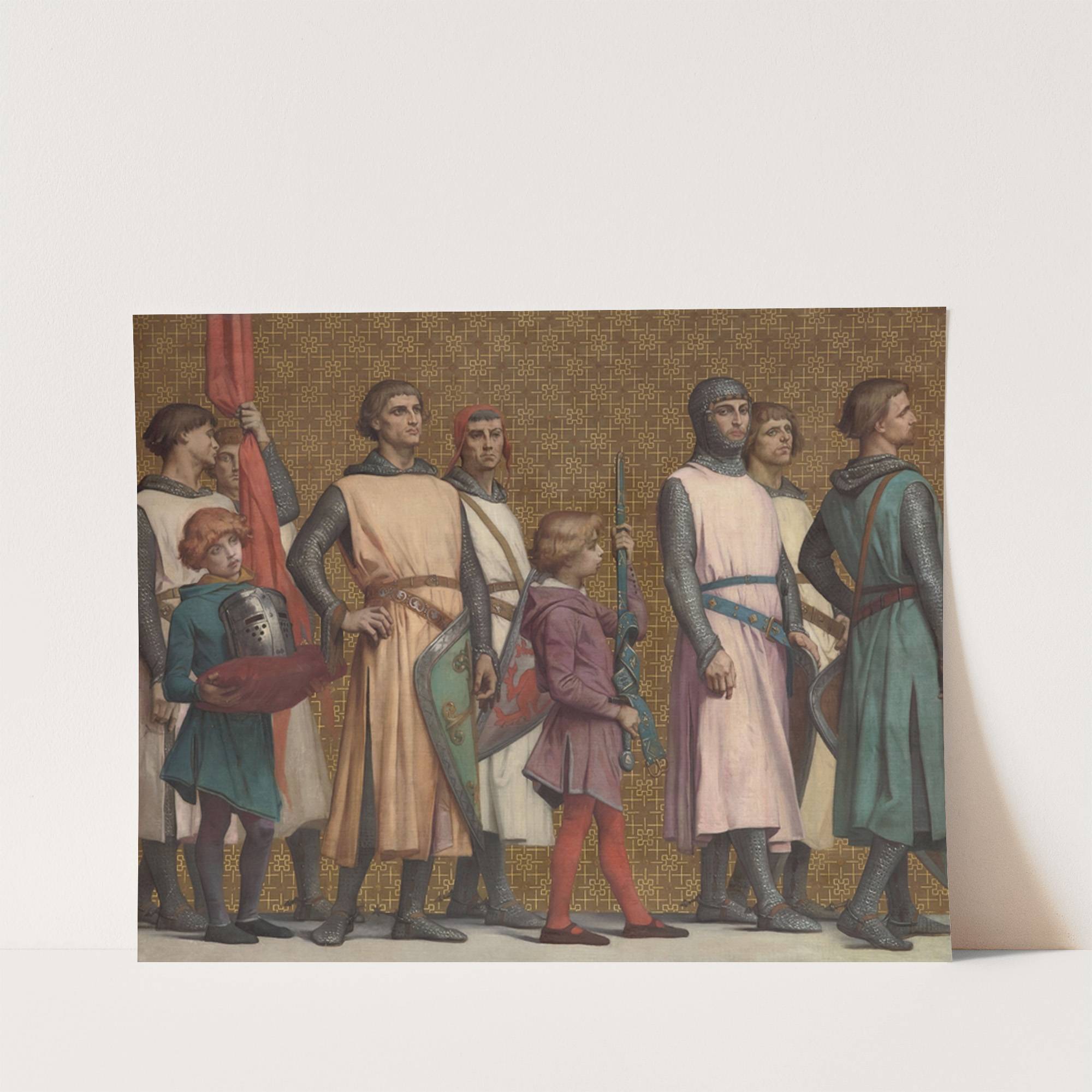 This exquisite art print captures "La Vie de Saint Louis" by Alexandre Cabanel in rich detail. The illustration features a group of medieval knights and children standing in formation against an ornate golden background with intricate patterns. The men, dressed...