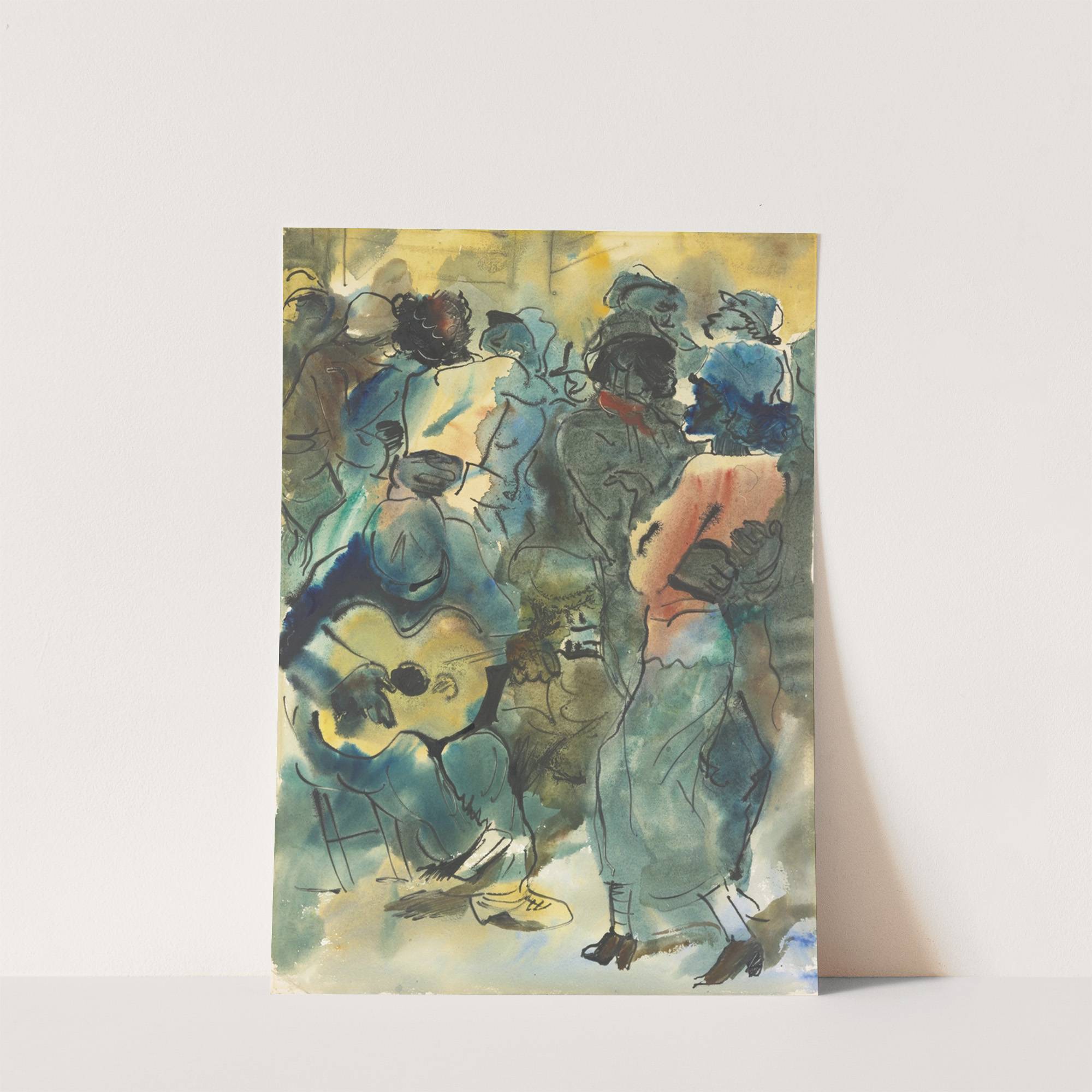 This vibrant art print features "Concert du soir" by Alexandre Jacovleff, depicting a lively social gathering from the early 20th century. The piece is rendered in a loose, expressive style with fluid, dynamic brushstrokes that convey motion and energy. Predominantly...
