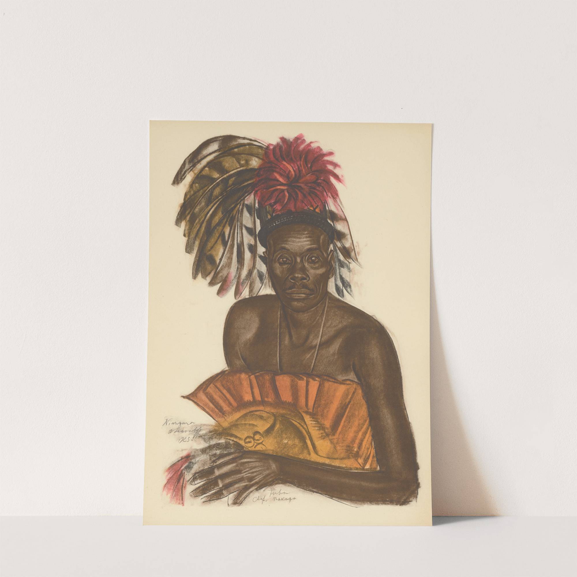 This striking art print by Alexandre Jacovleff features an evocative portrait of an African woman with deep brown skin. She wears a vibrant headdress adorned with large, multicolored feathers in shades of red, black, and white, adding a dynamic splash...
