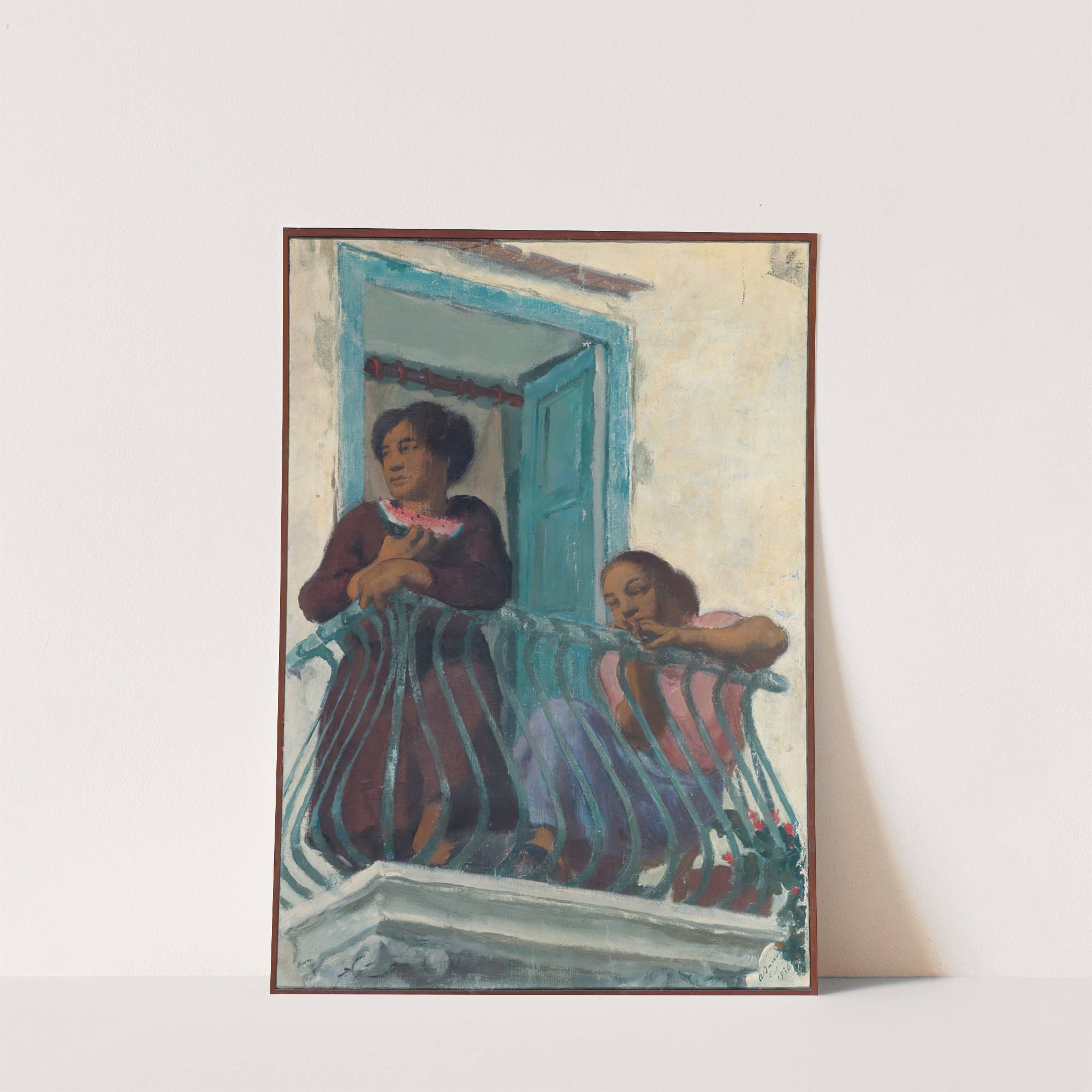 Experience the beauty of traditional realism with "On The Balcony" by Alexandre Jacovleff. This captivating painting portrays two women standing on an ornate balcony, bathed in warm, natural light that enhances their serene expressions and gentle poses. One woman, with...