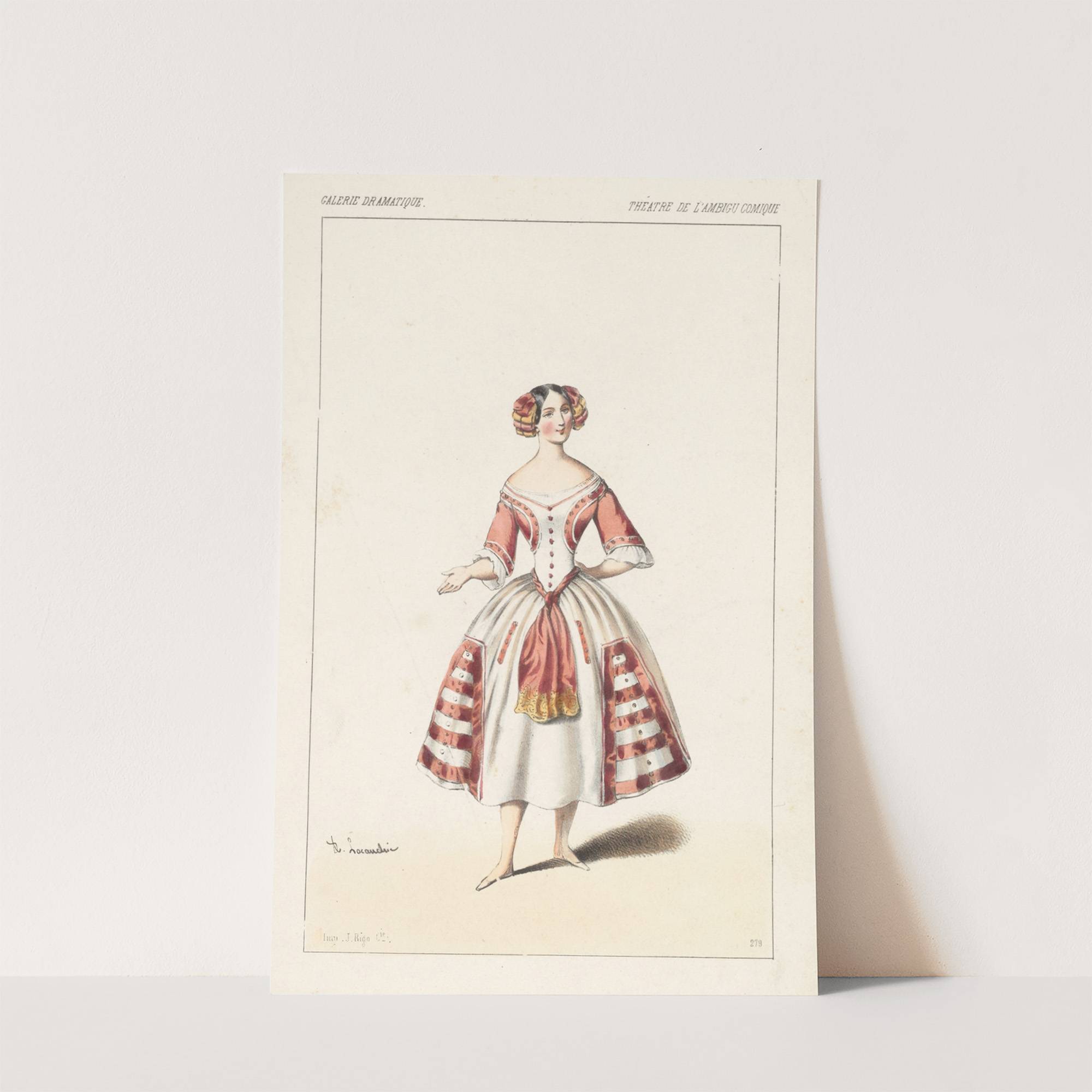 This art print features an elegant illustration of a woman dressed in traditional attire titled "Rôle de Paquita, dans L’étoile du berger." Created by artist Melle. Daniel, the piece showcases a beautifully detailed, full-length portrait of the subject standing against...