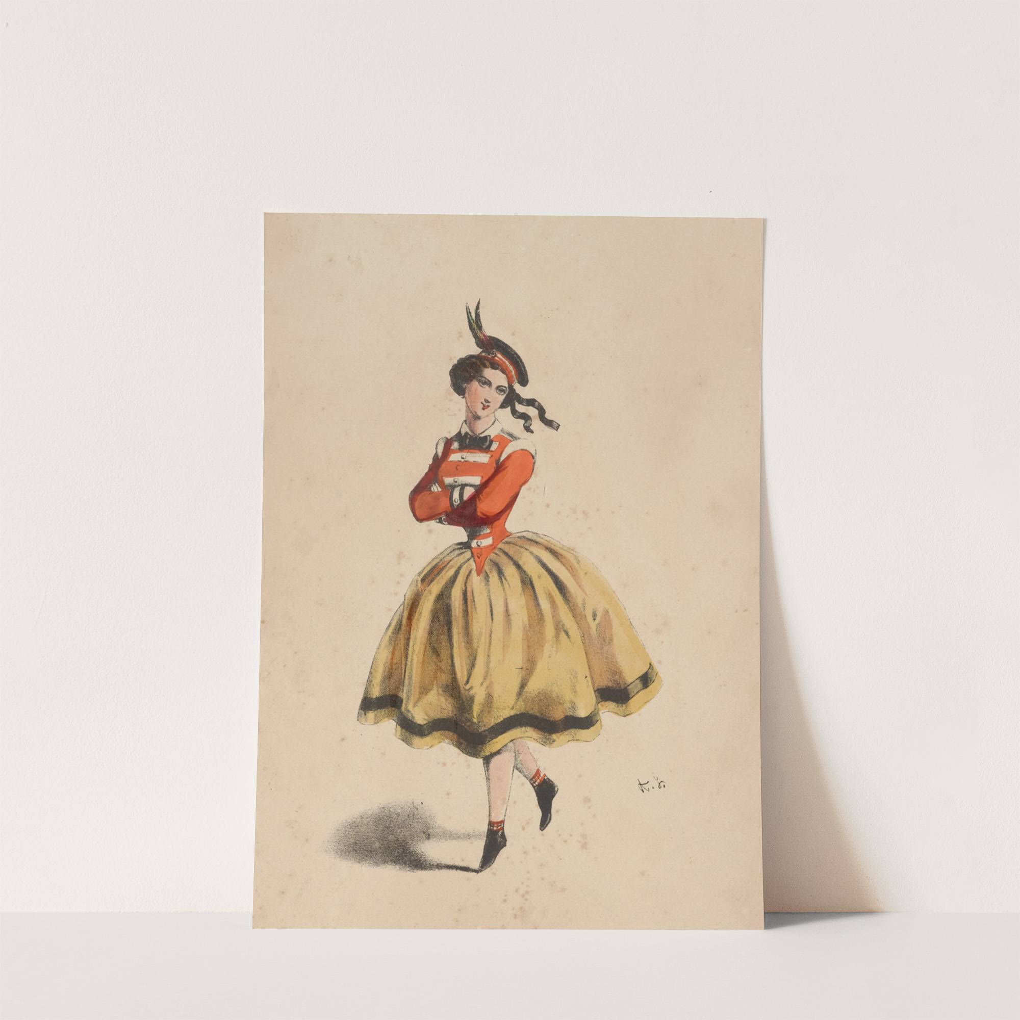 This artwork is a charming illustration featuring a young woman captured in a dynamic pose that exudes grace and elegance. Painted in a classic style reminiscent of mid-19th century fashion illustrations, the piece showcases a girl dressed in an outfit...