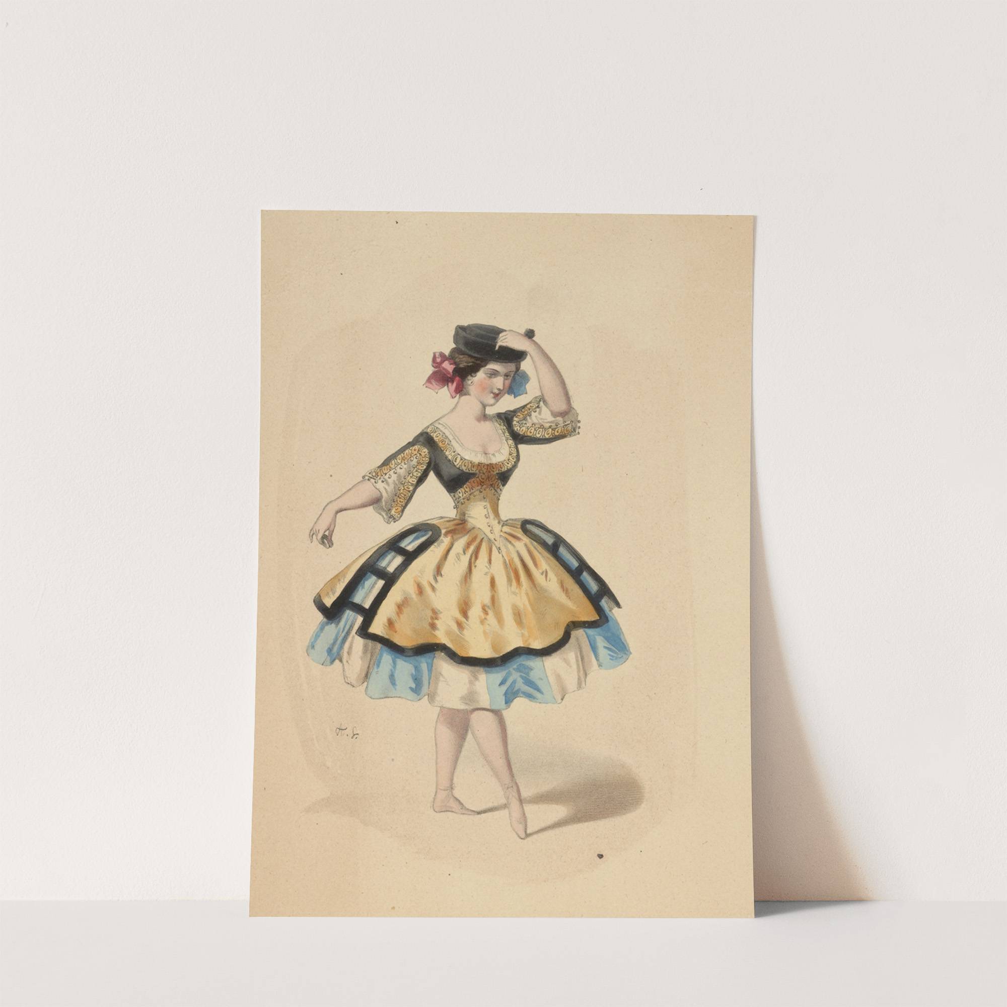 Introduce yourself to elegance with this exquisite illustration of a mid-19th century ballerina, "Théâtre de la Opéra Porte Saint-Martin" by Alexandre Lacauchie. The artwork captures a beautifully poised female dancer in her stage debut, dressed in an opulent ballet costume...