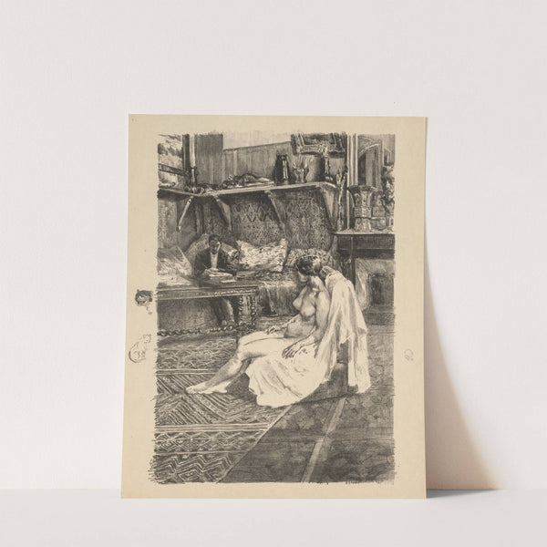 This black-and-white art print, titled "The Model Session (La Séance de modèle)" by Alexandre Lunois, captures an intimate and detailed scene from what appears to be an artist's studio. In the foreground, a nude female model with fair skin sits...