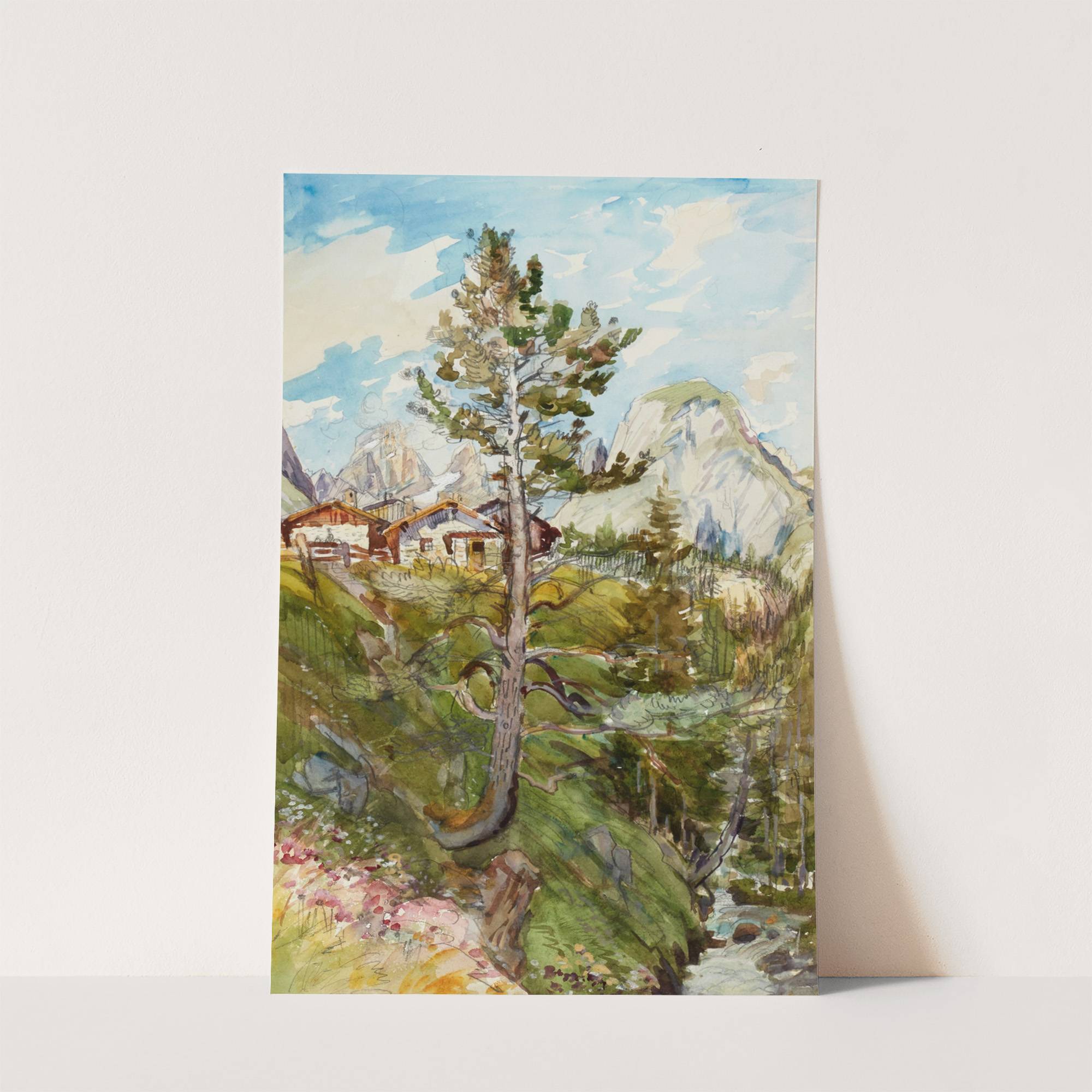 This vibrant watercolor painting by Alexandre Nozal, titled "Carnet de Dessins Pl.38 (1908)," beautifully captures a serene mountain landscape. The central figure is a tall, slender pine tree with a slightly twisted trunk, standing prominently in the foreground. Its green...