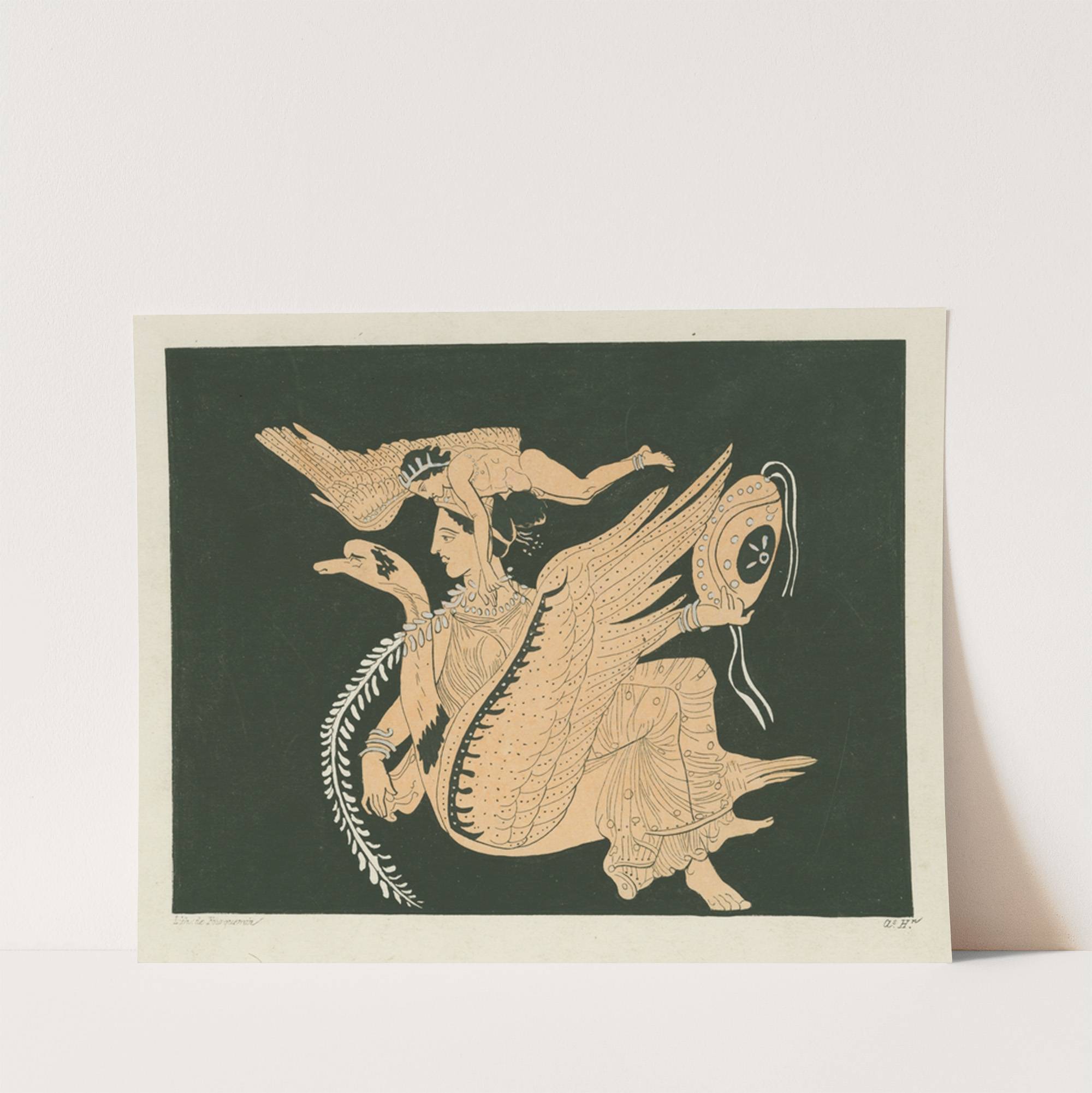 This art print features "Venus Sitting on a Swan and Accompanied by a Hermaphrodite," an intricately detailed piece by Alexis Louis Pierre Housselin, created between 1844 and 1861. The artwork is rendered in a bold, contrasting black-and-beige color palette, with...