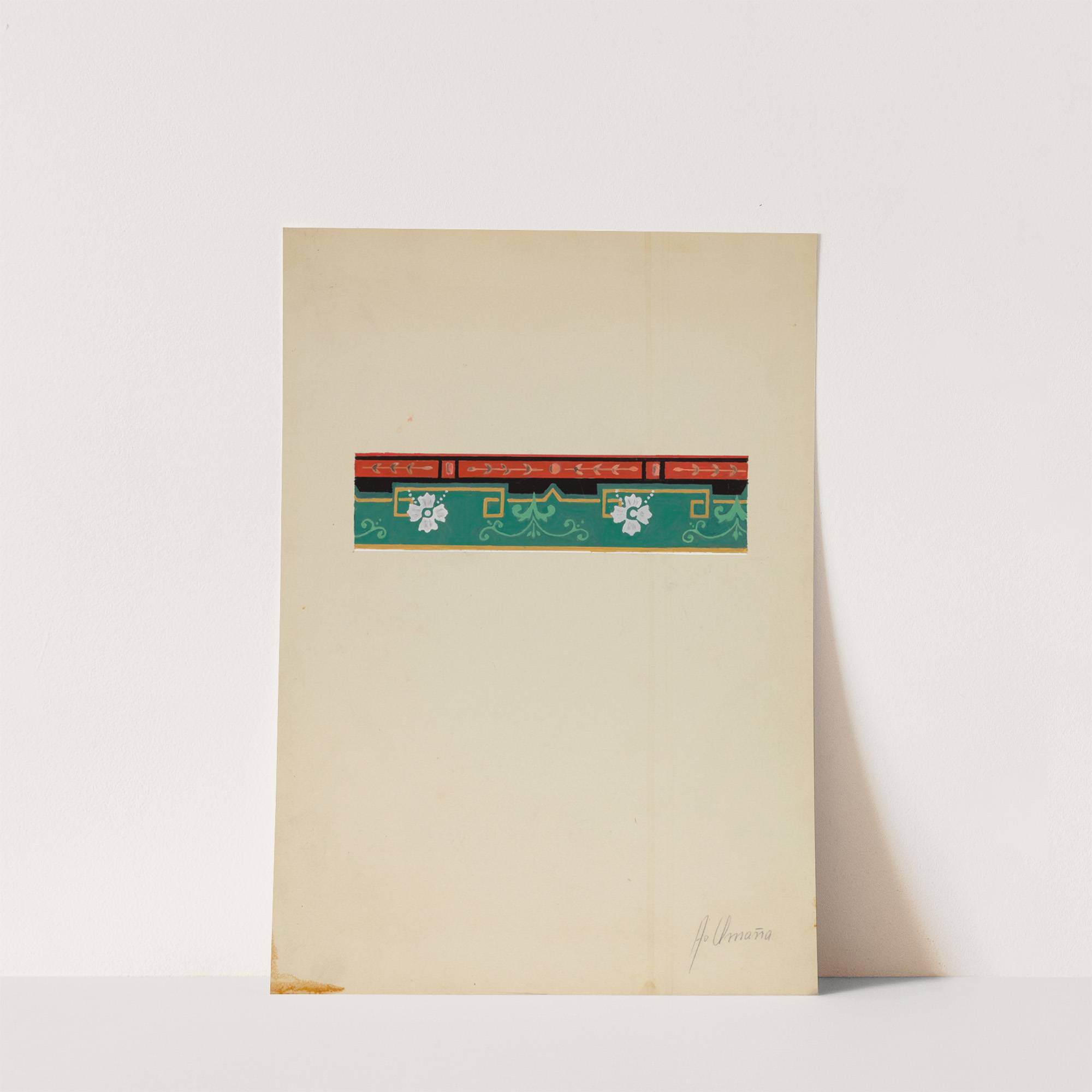 This art print showcases "Wall Paper Border" by Alfonso Umana, featuring a vibrant and intricate design. The top section of the image is dominated by a bold red brick pattern, which adds an urban touch to the piece. Below the...