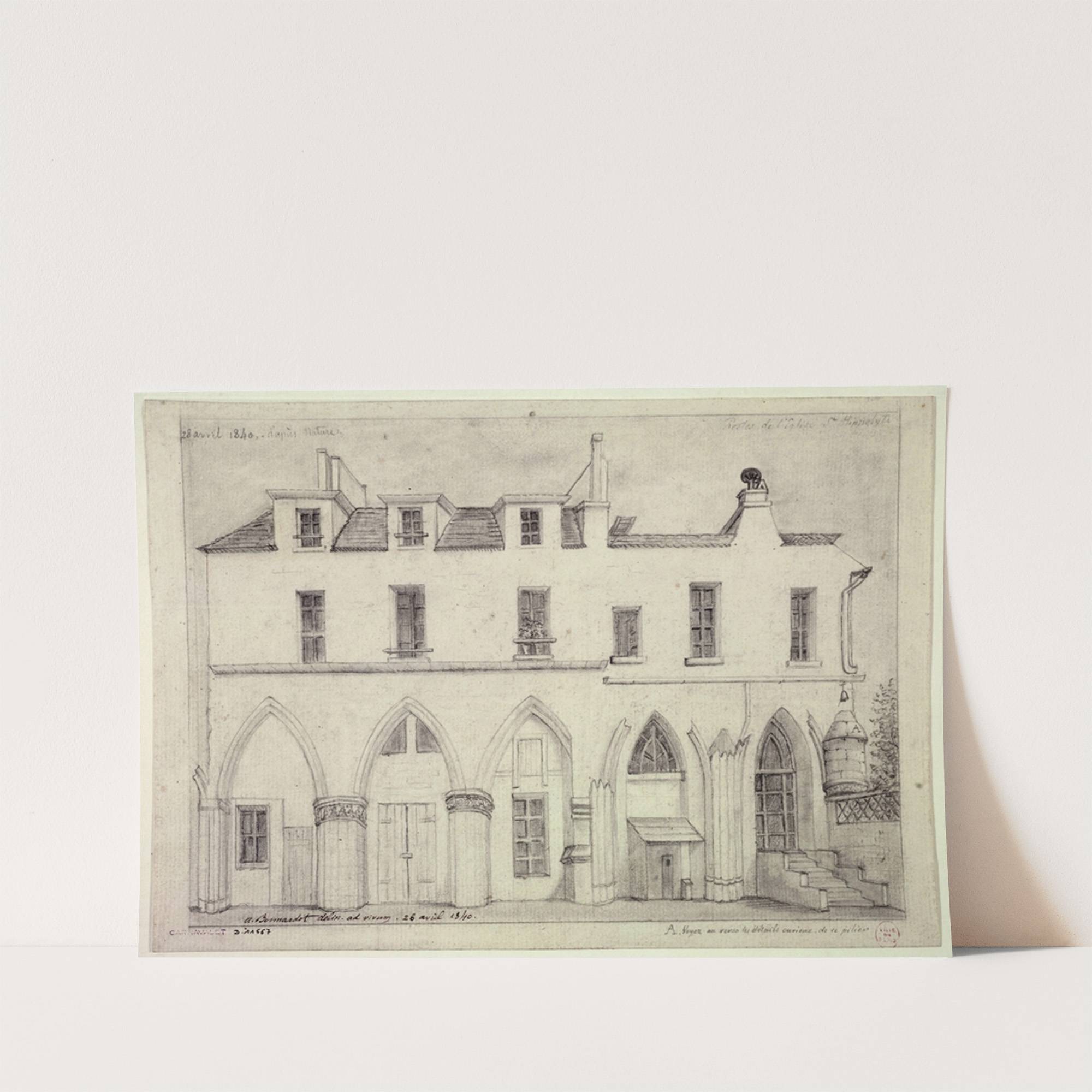 This artwork is "Restes de l'église Saint-Hippolyte" by Alfred Bonnardot, a beautifully detailed architectural drawing done in monochromatic pencil. The image captures the facade of an old European building, characterized by its classic Gothic arches and intricate stone details. The...