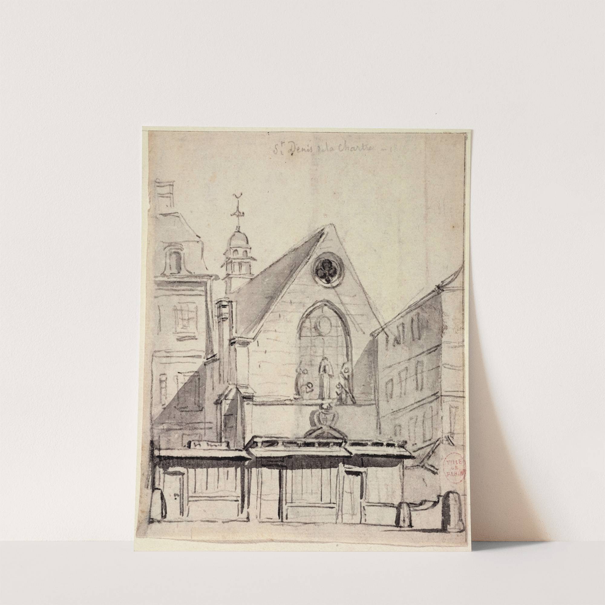 This black-and-white sketch captures the charming architecture of Saint-Denis de la Châtre. The artist uses delicate pencil strokes to depict a series of buildings with classic European architectural features, including steep roofs and arched windows. Prominently, there is a church...