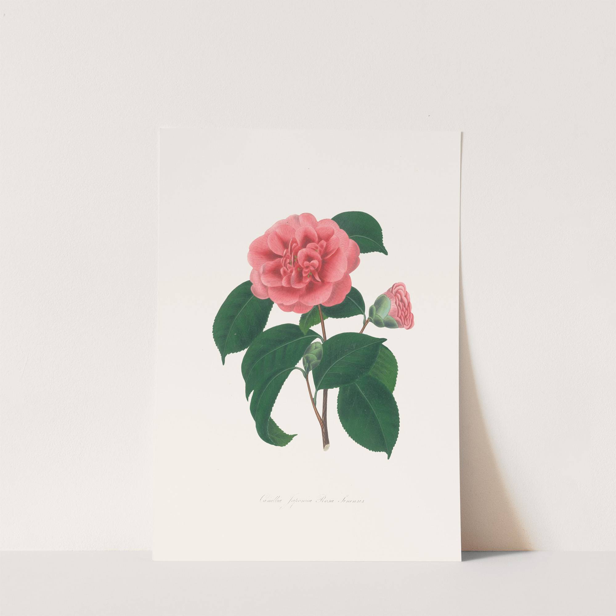 This vibrant botanical illustration features a single pink camellia flower in full bloom, accompanied by a budding pink rose in the background. The camellia's delicate petals are meticulously detailed with soft gradients of pink, creating a realistic and inviting appearance....