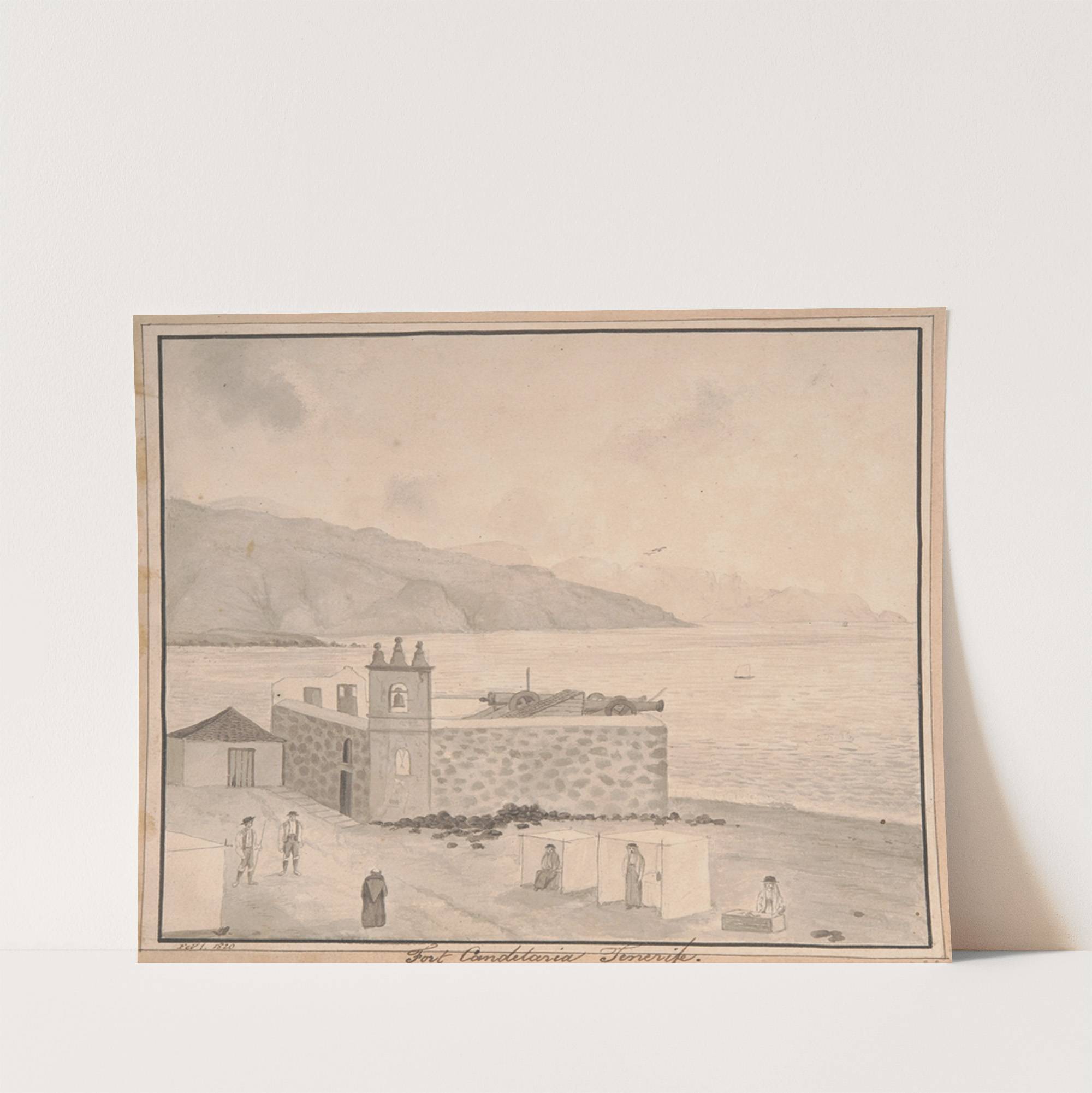 Experience the serene beauty of coastal life with this elegant watercolor print titled "Fort Candelaria, Tenerife" by Alfred Diston. This delicate illustration features a stone chapel standing resiliently along a tranquil beachfront, its modest structure contrasted against the soft, hazy...