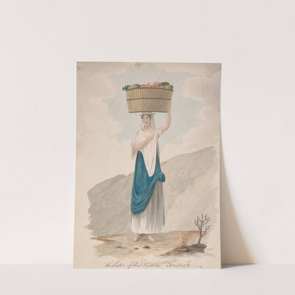 This elegant print features "Huckster of Port Orotava" by Alfred Diston, showcasing a captivating scene with intricate details and rich colors. The central figure is a serene woman adorned in traditional white and blue attire, her flowing garments exuding a...