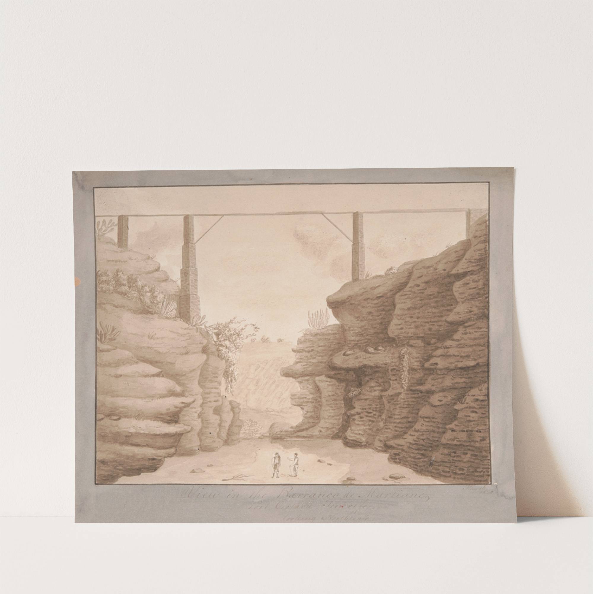 This captivating print showcases "View in the Barrancos de Martianez, Port Orotava, Tenerife, Looking Northward" by artist Alfred Diston. The artwork captures a serene and slightly mystical landscape with a soft, monochromatic palette of browns and whites. The scene depicts...