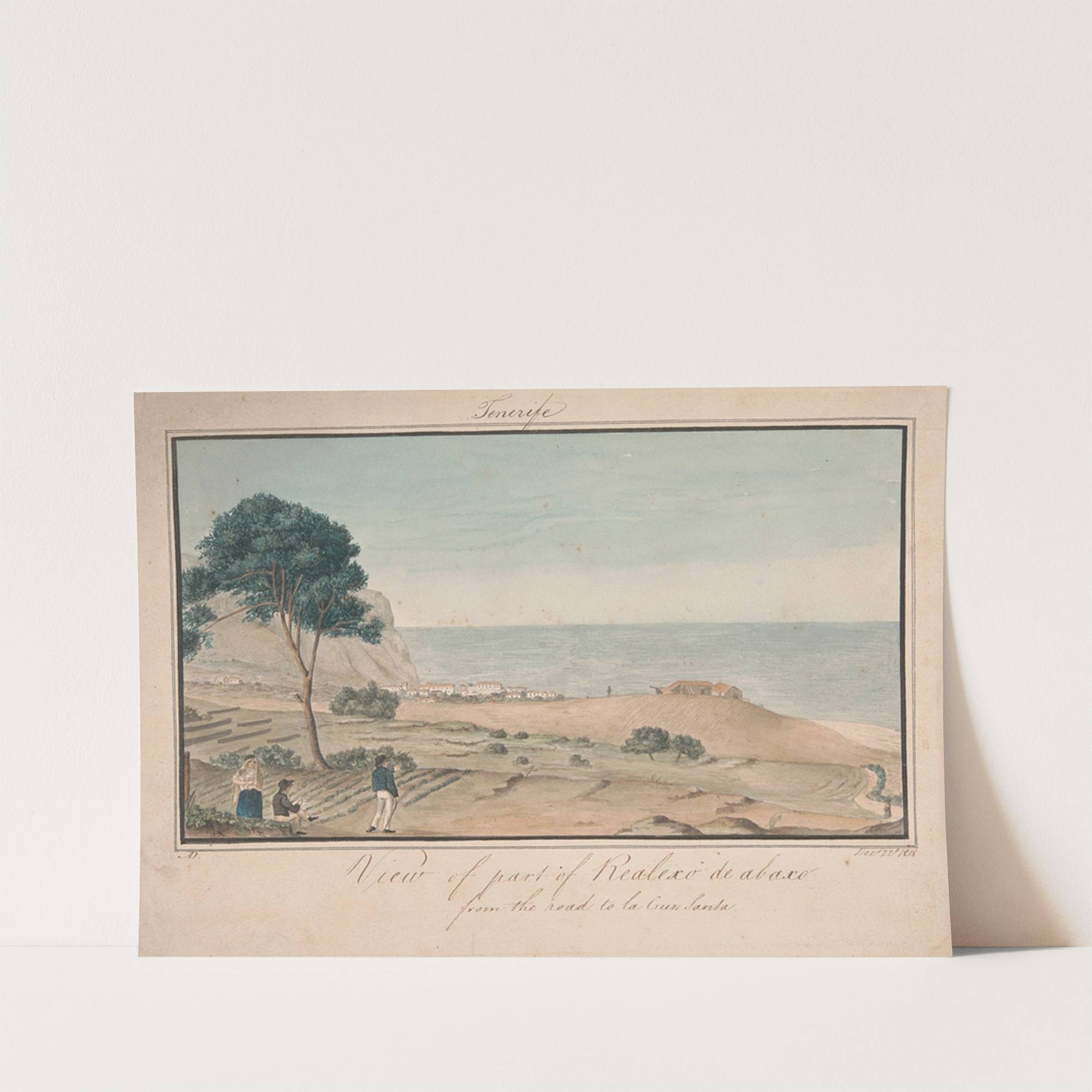 This art print is a beautifully detailed landscape illustration titled "Vue du Partie de Abasco au Cruz Santa," created by artist Alfred Diston. The scene captures a serene coastal view, featuring gentle rolling hills that gradually slope down to meet...