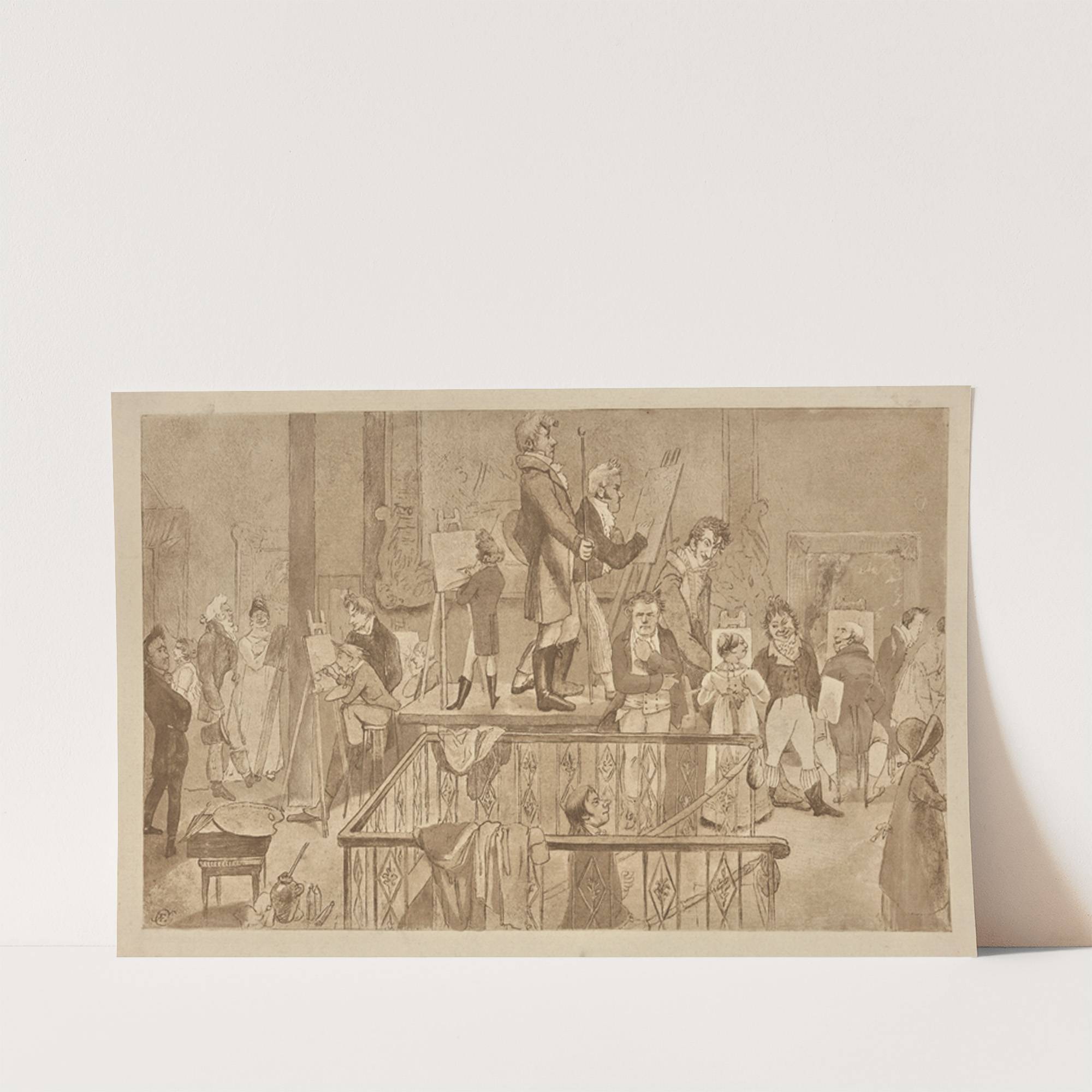 This charming sepia-toned illustration features a lively scene from the world of art exhibitions, as depicted by Alfred Edward Chalon in 1884. The artist captures a bustling atmosphere filled with activity and engagement. In the foreground, artists are passionately working...