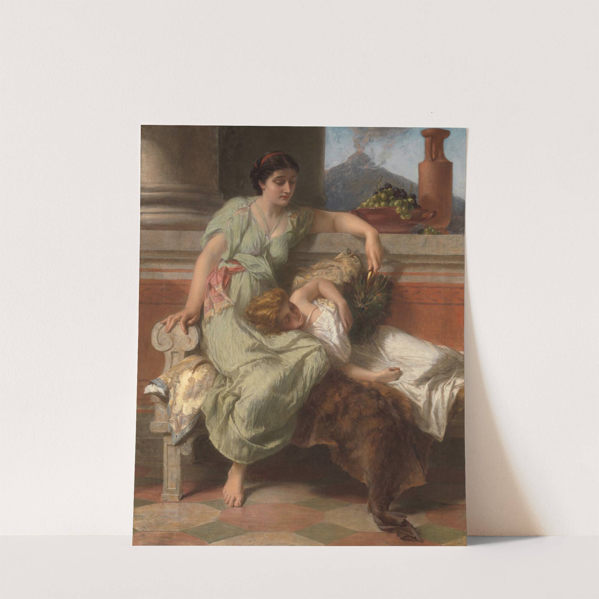 This classic art print depicts "Pompeii, A.D. 79" by Alfred Elmore, capturing an intimate moment of ancient Roman life. The central figures include a serene woman with fair skin, dark hair tied back with a red headband, and a modest...