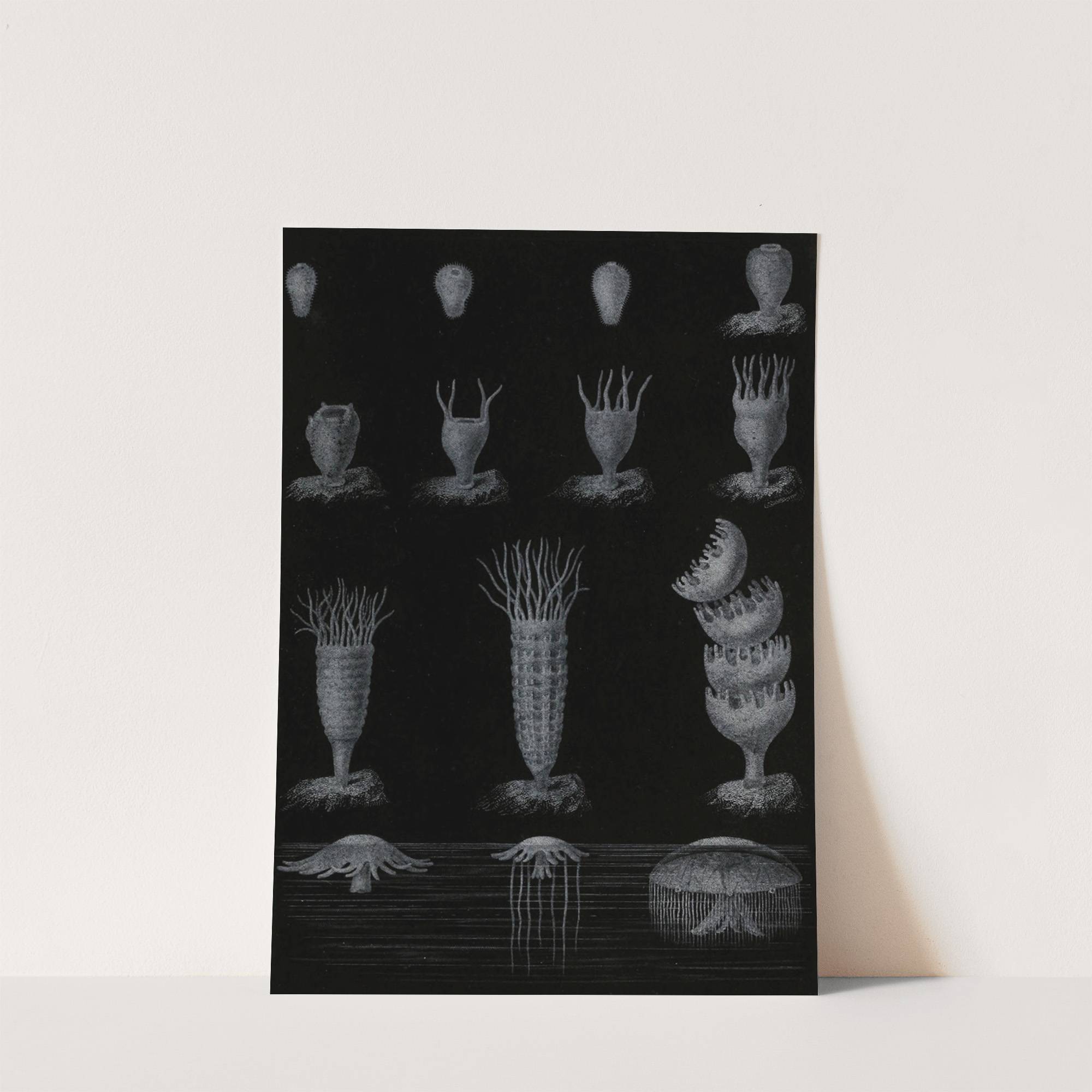 This striking art print depicts "Développement de la Méduse" by Alfred Frédol, showcasing an eerie and otherworldly array of aquatic creatures rendered in a monochromatic blue-white palette. The background is a deep black, which intensifies the ethereal glow of each...