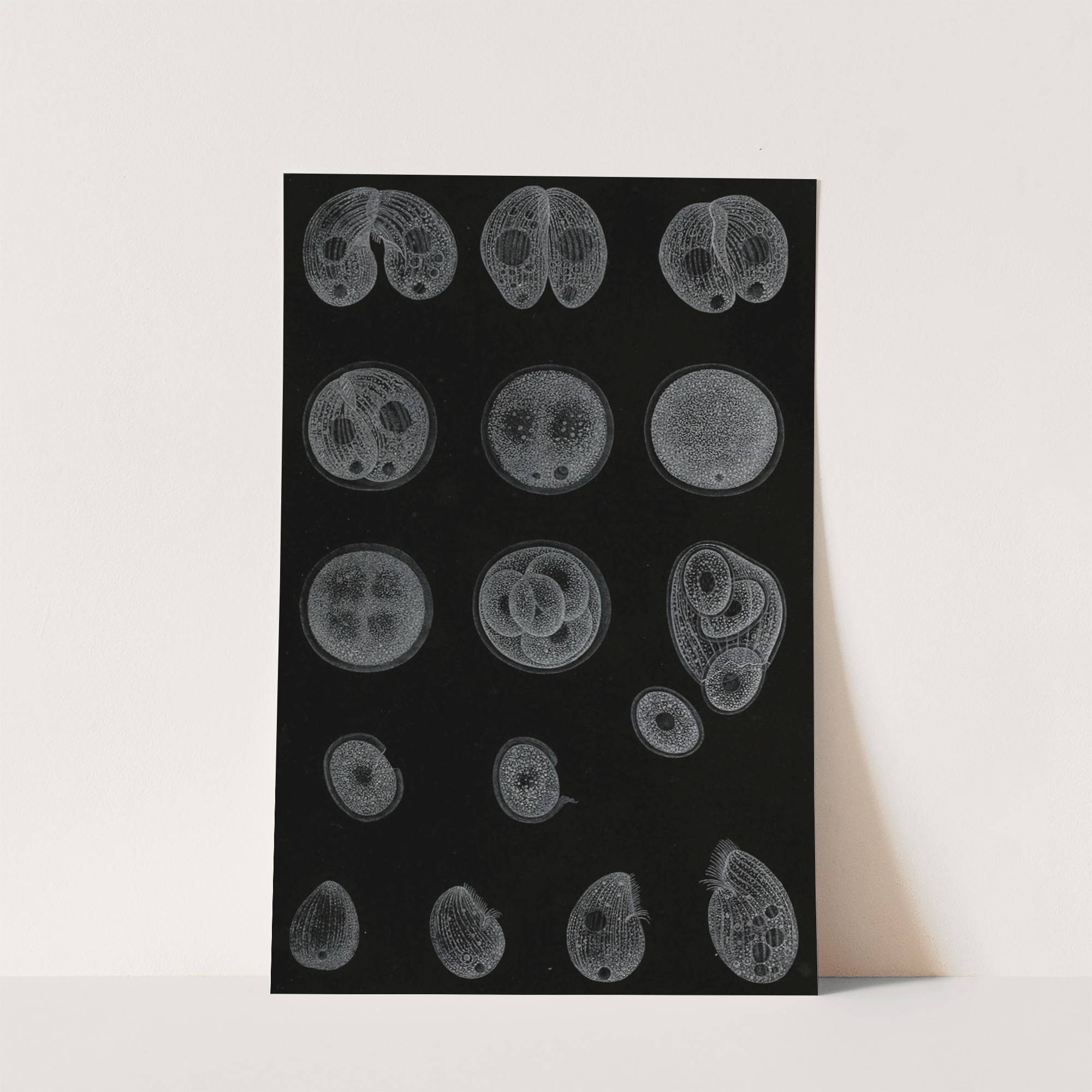 This striking art print features "Développement d'un Infusoire" by Alfred Frédou, showcasing a mesmerizing series of micrograph images set against a deep black background. The artwork consists of numerous detailed illustrations of microscopic organisms, each varying in shape and size....