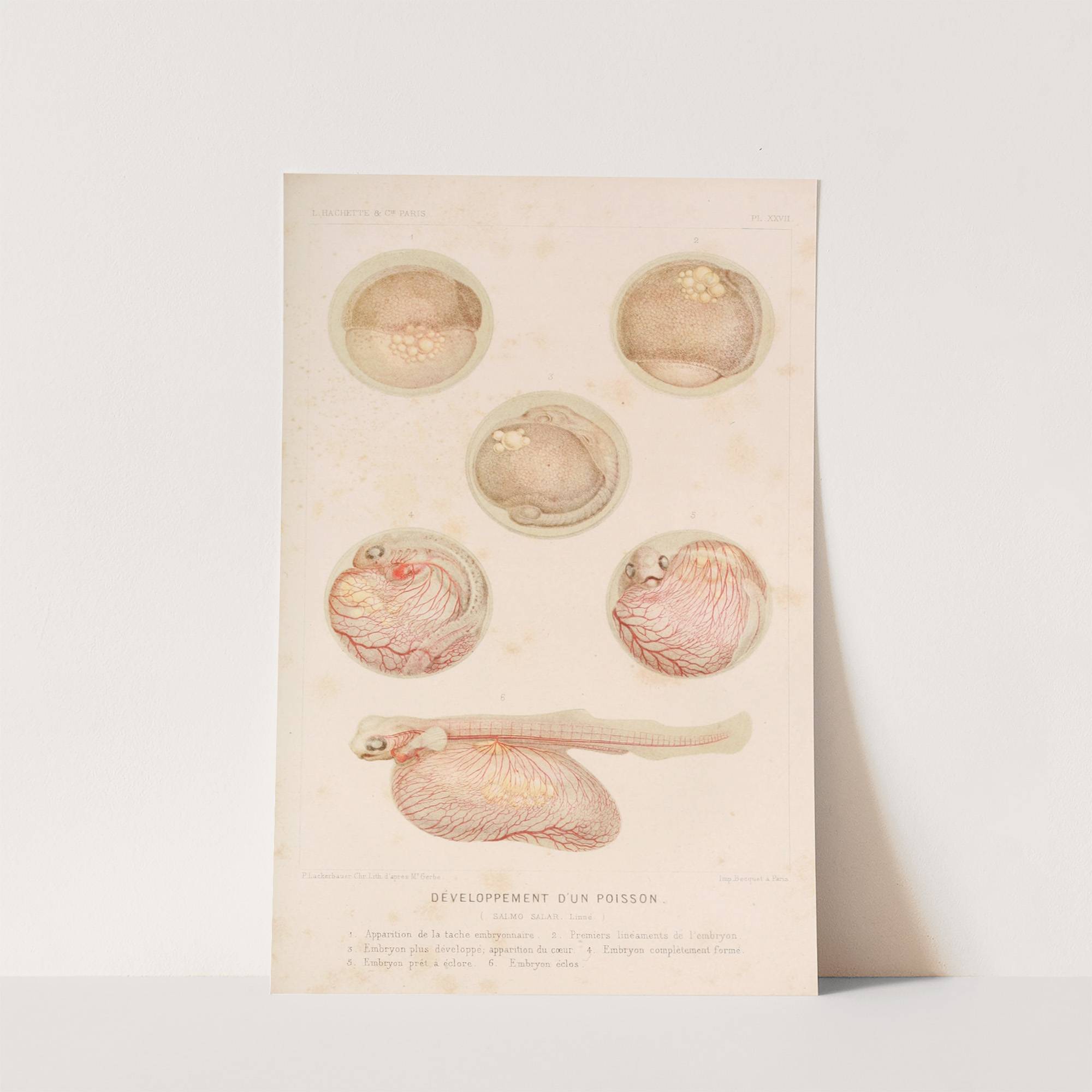 Introducing "Development of a Fish" by Alfred Frédrol, a captivating scientific illustration that beautifully showcases the stages of fish development. This exquisite print features six delicate, semi-translucent cross-sections of embryonic fish, each intricately detailed with fine pen and ink strokes...