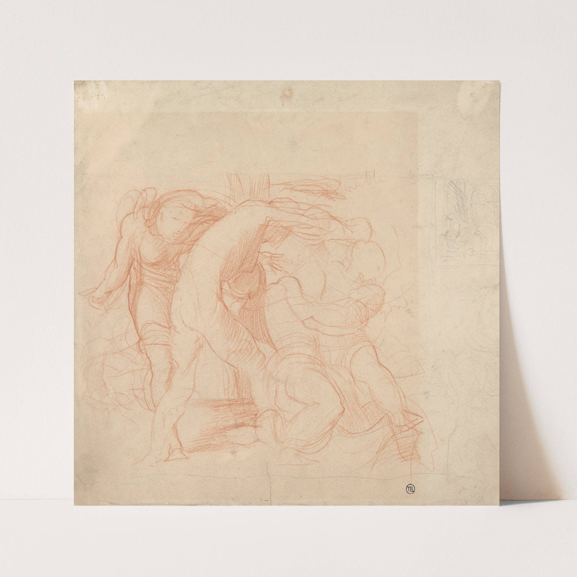 This artwork is a delicately sketched study in red pencil titled "Study for Massacre of the Innocents" by Alfred George Stevens. It features a poignant scene with two figures lying on the ground, their forms rendered with fluid, expressive lines...