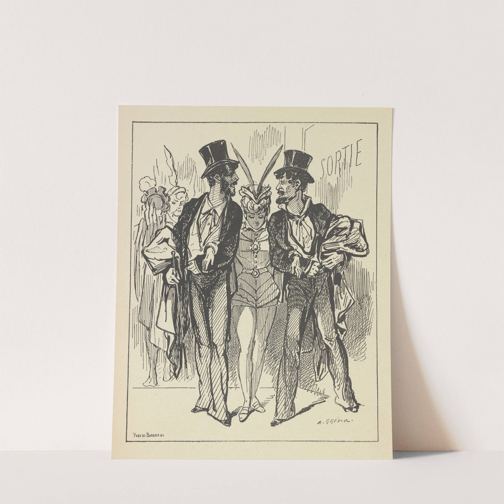 This black-and-white illustration, titled "À l'Opéra" by Alfred Grévin from the period between 1870 to 1879, captures a lively scene at an opera house. Three male figures stand prominently in the foreground, each distinguished by their elaborate attire and top...