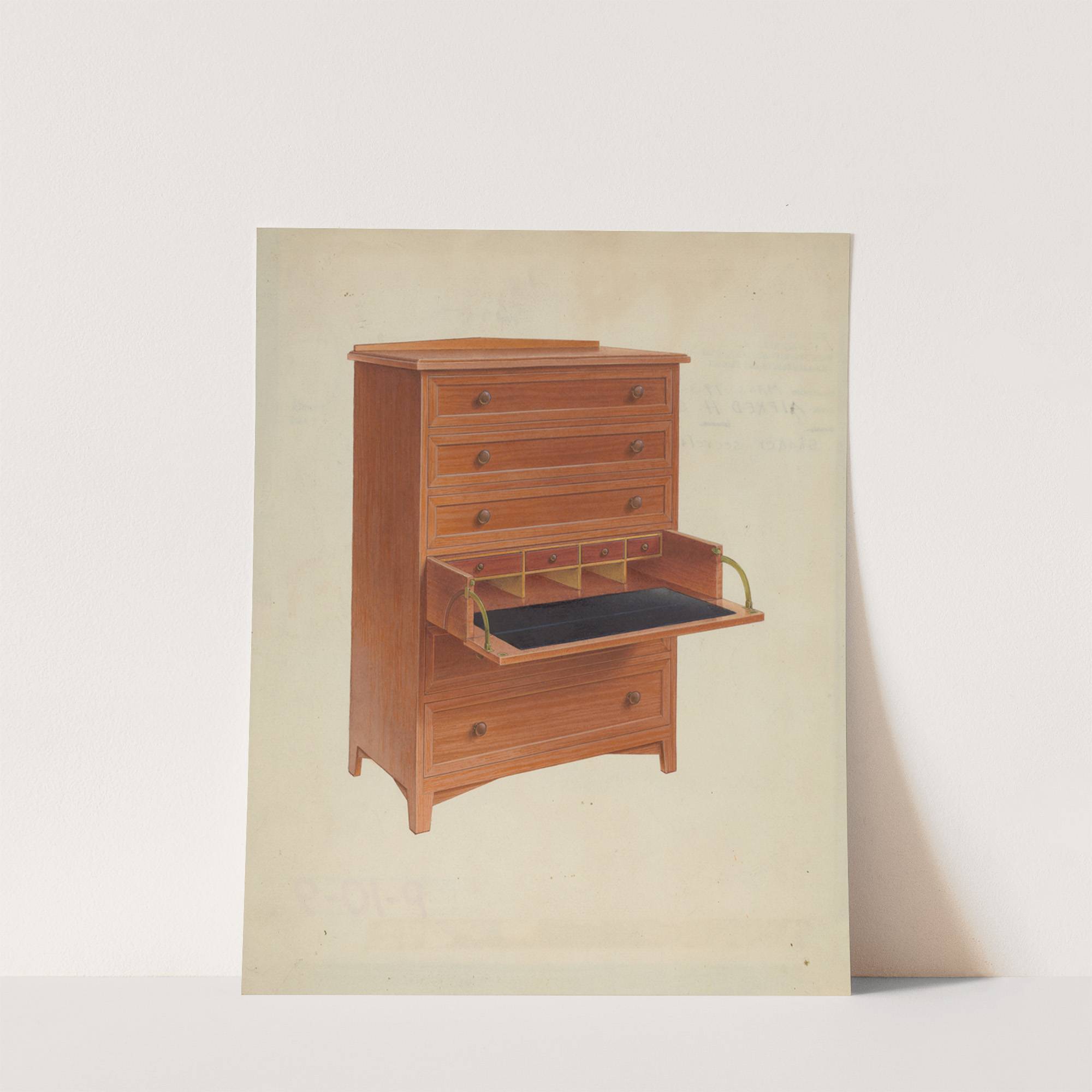 This elegant wooden dresser is a masterpiece of traditional craftsmanship, showcasing a rich, warm reddish-brown finish that highlights the natural wood grain. The piece features six drawers arranged in three tiers, each drawer adorned with simple round, dark brown knobs...