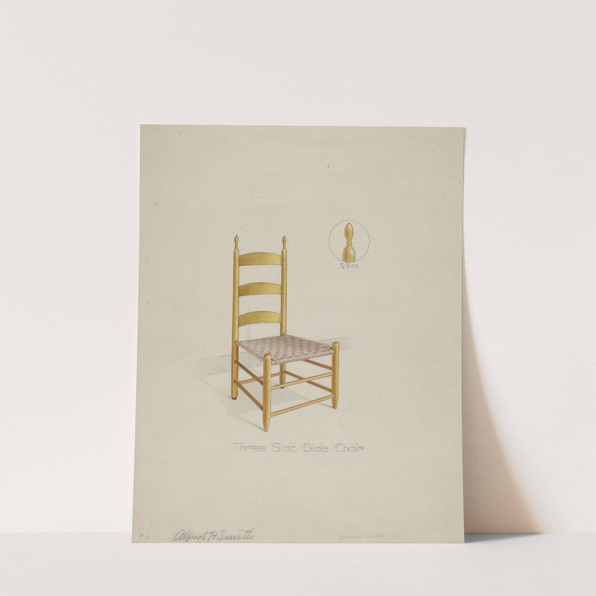 This art print features "Three Seat Side Chair," a meticulously detailed illustration of a classic wooden chair by artist Alfred H. Smith. The chair is depicted in warm golden hues with a natural wood finish, showcasing its simple yet elegant...