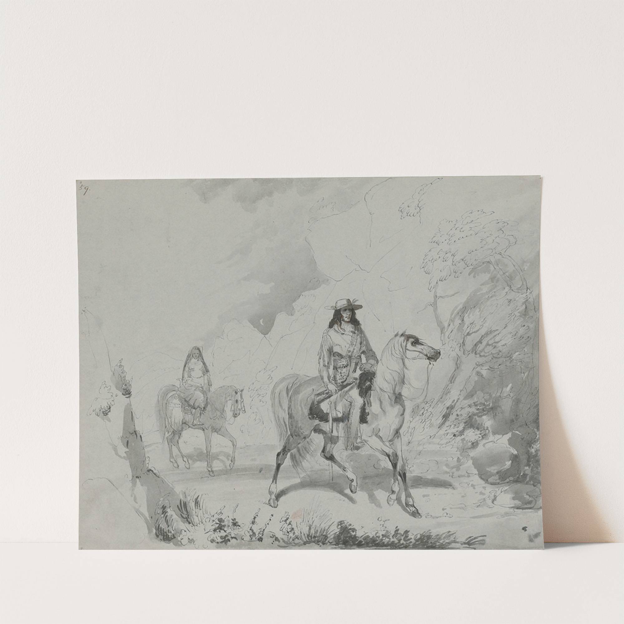 This elegant black-and-white lithograph captures the rustic beauty of a mountainous landscape, rich in detail and texture. Two mounted figures traverse a serene path through a rugged terrain, their horses depicted with meticulous attention to line and form. The central...