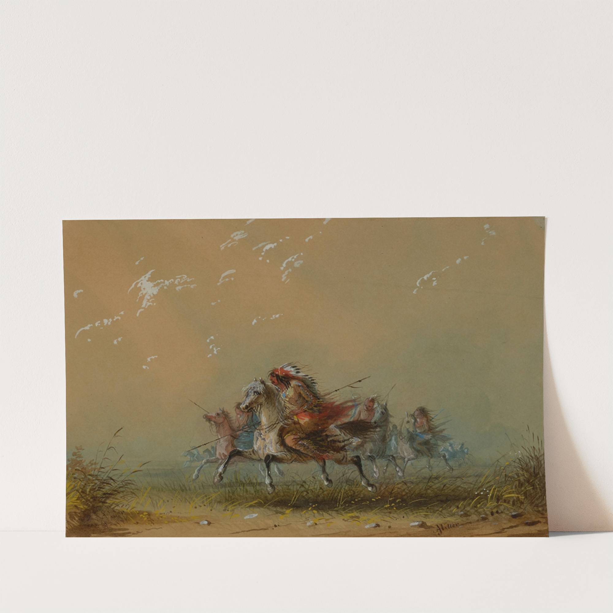 This dynamic print titled "Indians on the War Path" by Alfred Jacob Miller captures a powerful moment of Native American warriors in mid-charge across an open landscape. The composition features four figures mounted on galloping horses, their movements rendered with...