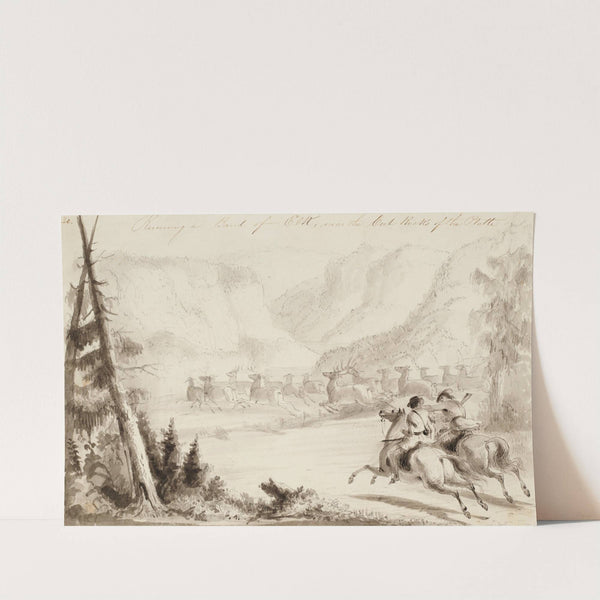 This art print features a striking monochrome sketch titled "Running a Bank of Elk, Near the Cut Rocks of the Platte" by Alfred Jacob Miller. The piece captures a dynamic scene with three elk in mid-stride, depicted with expressive, fluid...
