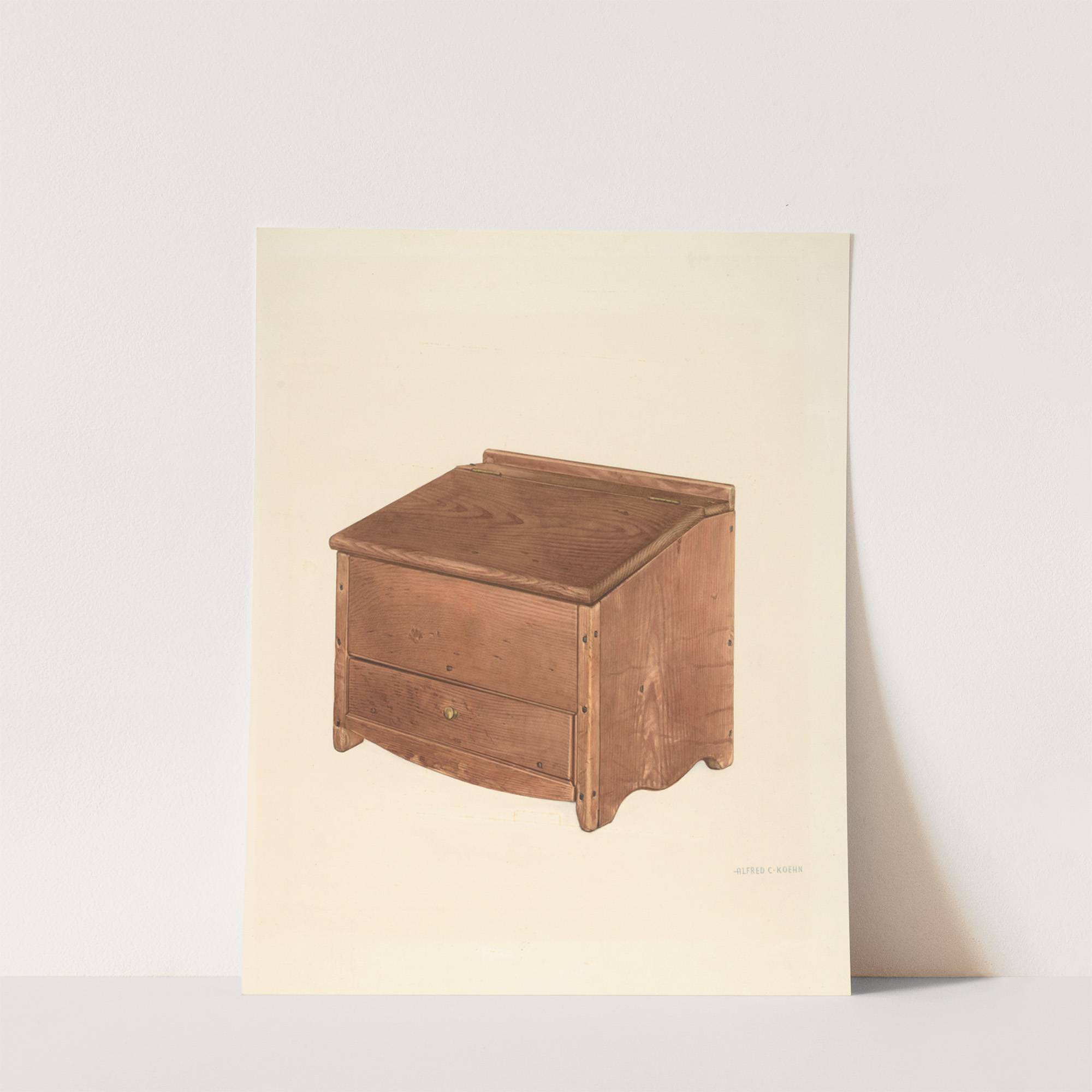 This art print features "Bible Box" by Alfred Koehn, showcasing a beautifully crafted wooden bedside table or storage box with an antique charm. The piece is rendered in rich, warm wood tones that highlight the natural grain patterns of the...