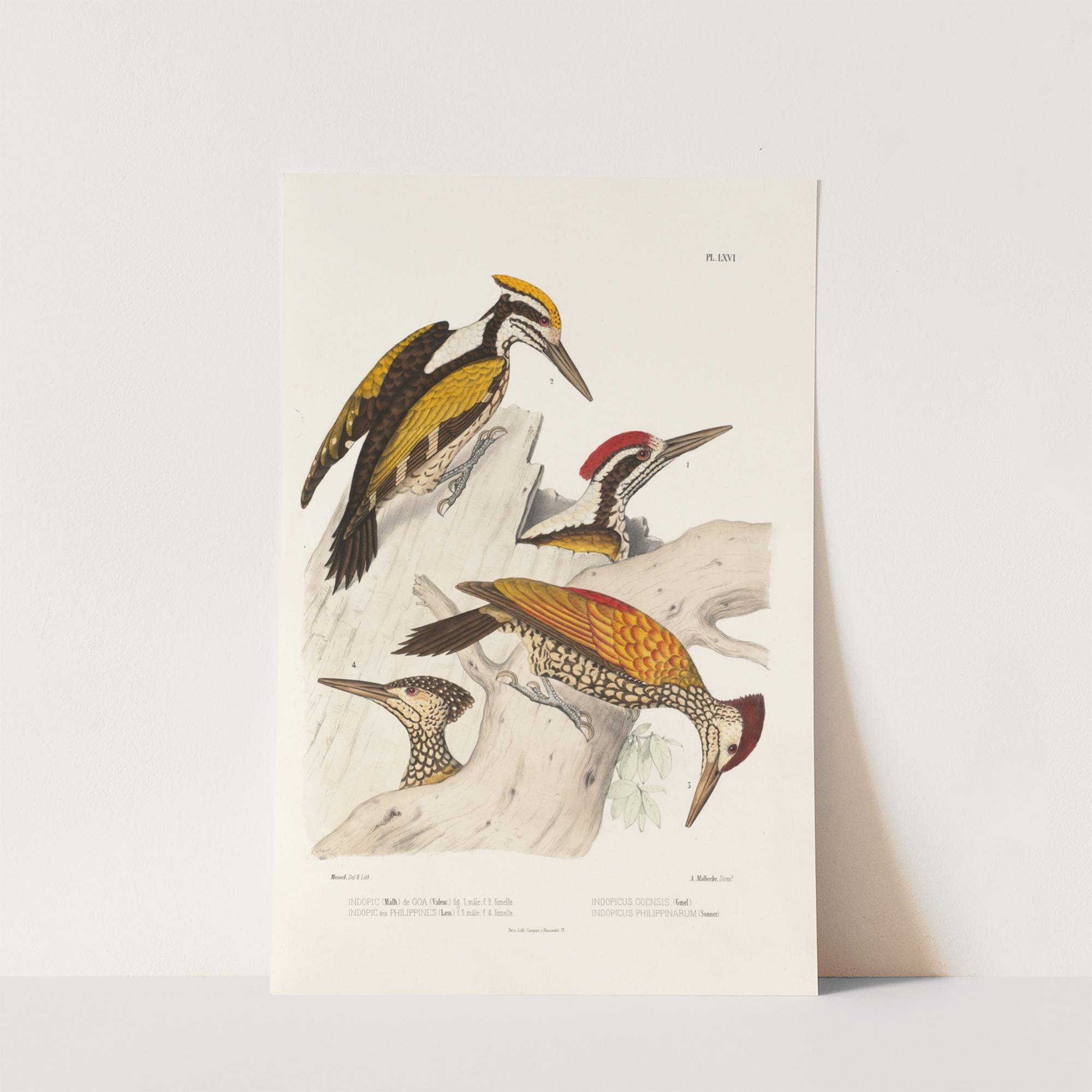This vibrant art print features "Monographie des picidées pl05" by Alfred Malherbe, showcasing three detailed woodpecker illustrations against a clean white background. The birds are artistically rendered with precise, colorful feather patterns and textures that highlight their unique characteristics.The top...