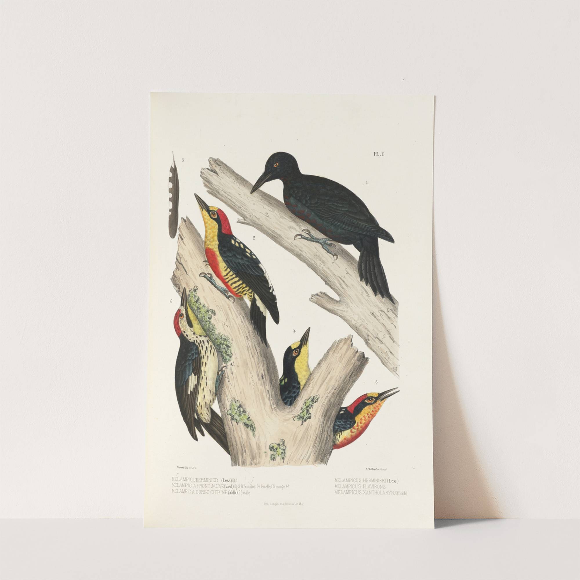 This captivating print showcases "Monographie des picidées pl29" by the artist Alfred Malherbe. The piece features an intricate depiction of several woodpeckers perched on a tree branch, rendered in a traditional, stylized manner that highlights the vivid colors and distinctive...